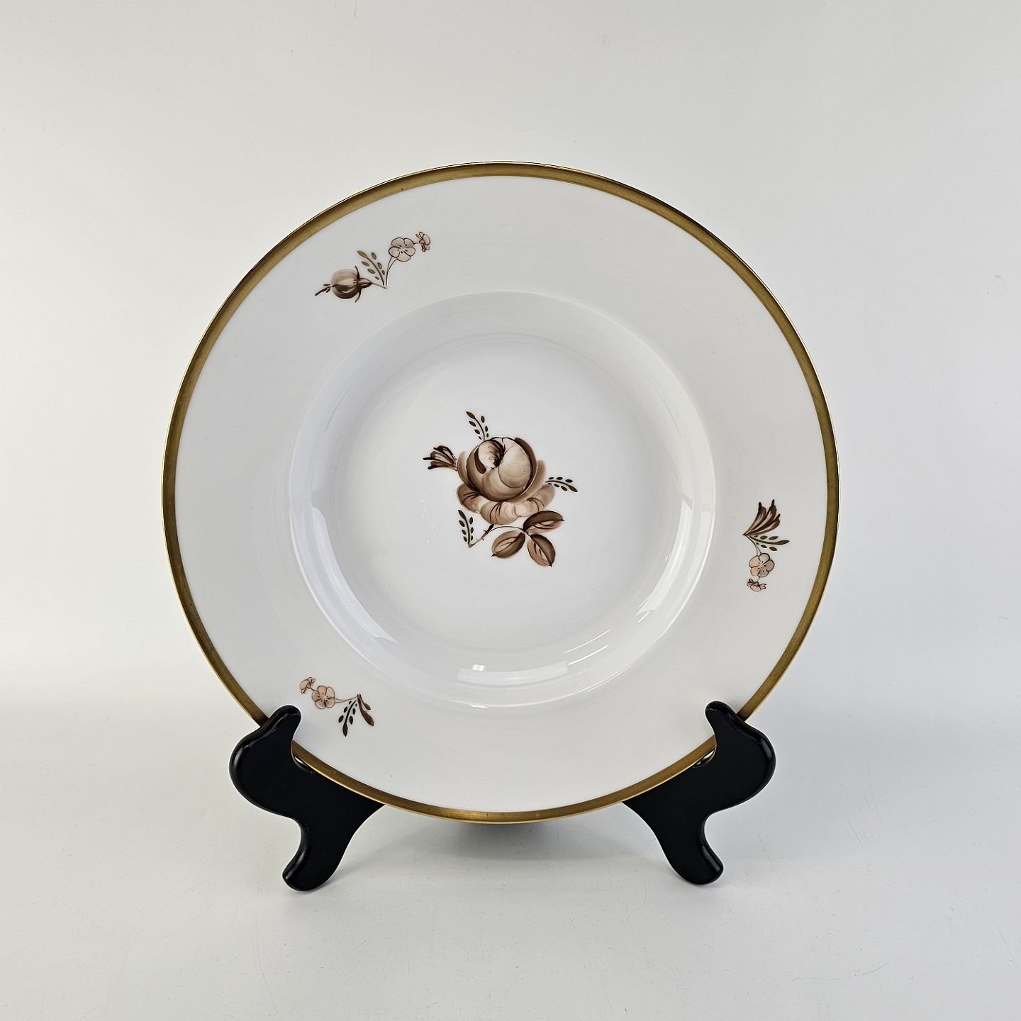 Stel i glat hvidt porcelæn dekoreret med brune roser og guldbort