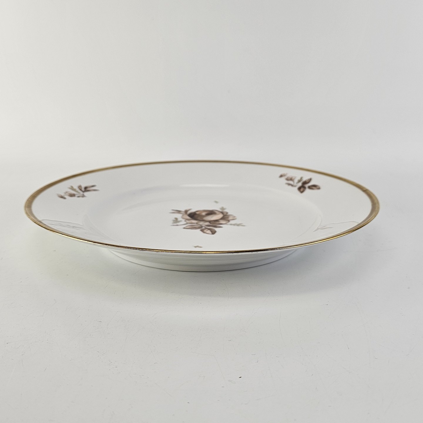Stel i glat hvidt porcelæn dekoreret med brune roser og guldbort