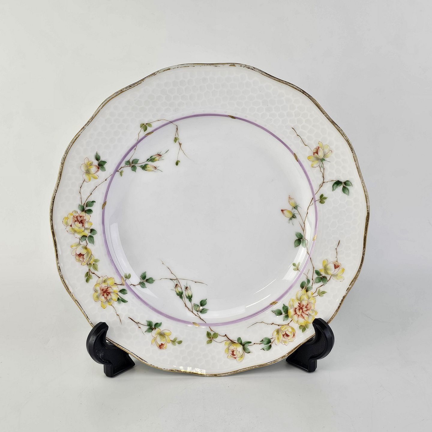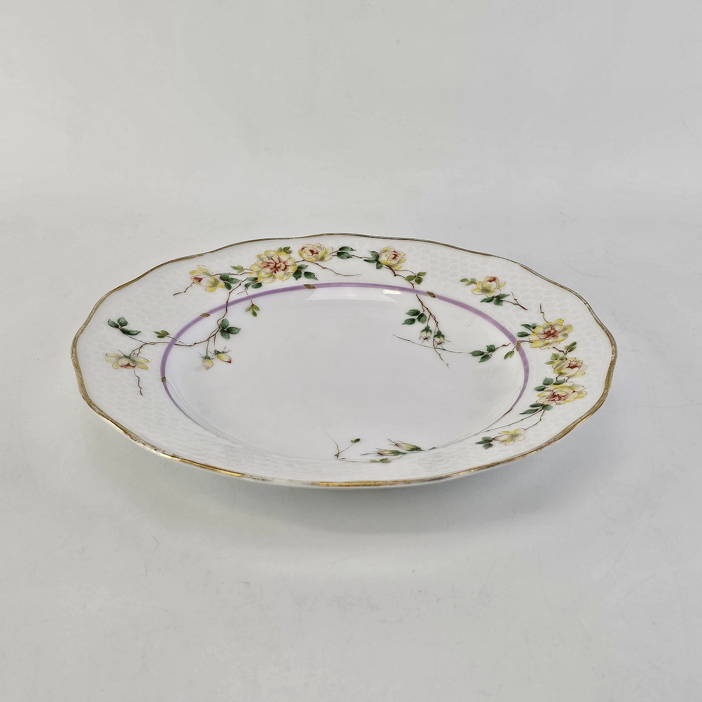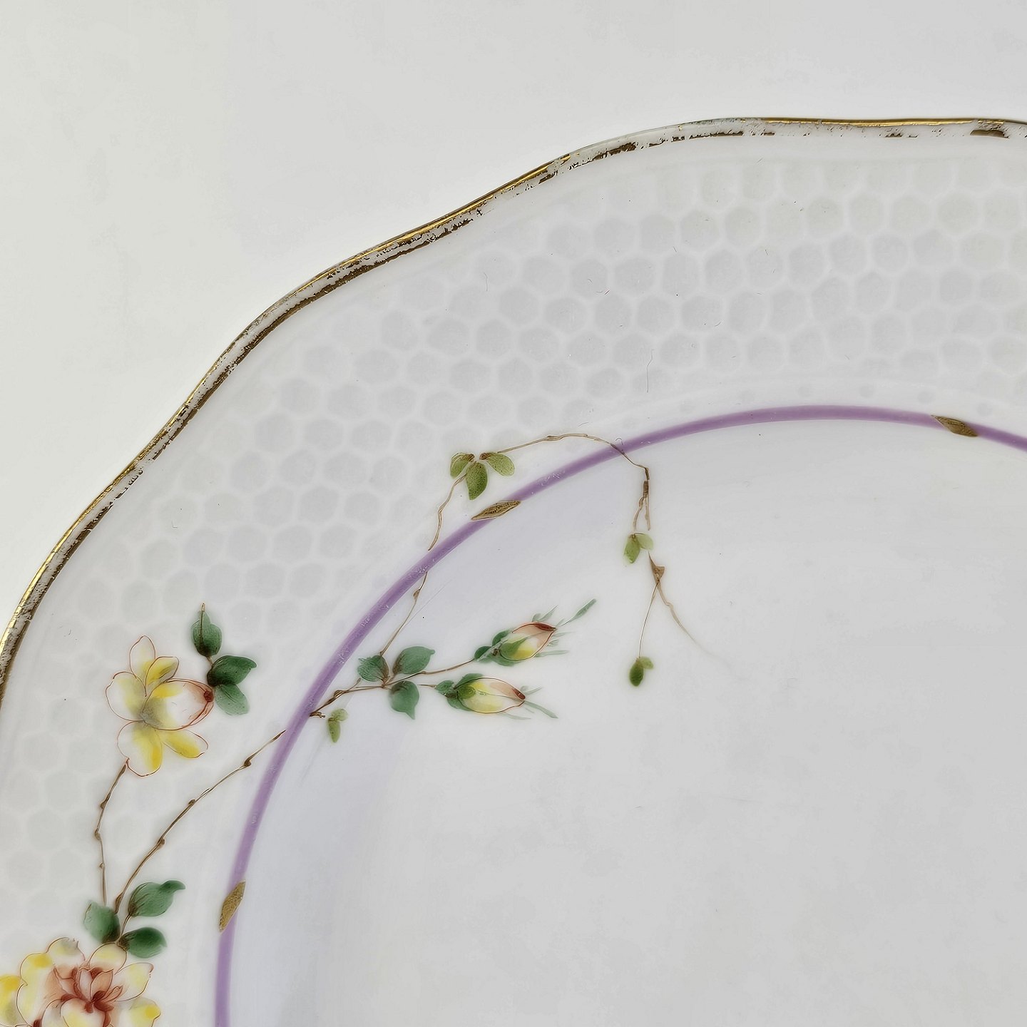 Service i hvidt porcelæn med hamret kantmønster dekoreret med gule blomsterranker og lyslilla streg. Stellet er med guldkant og det er mærket med bølger anvendt frem til 1890.