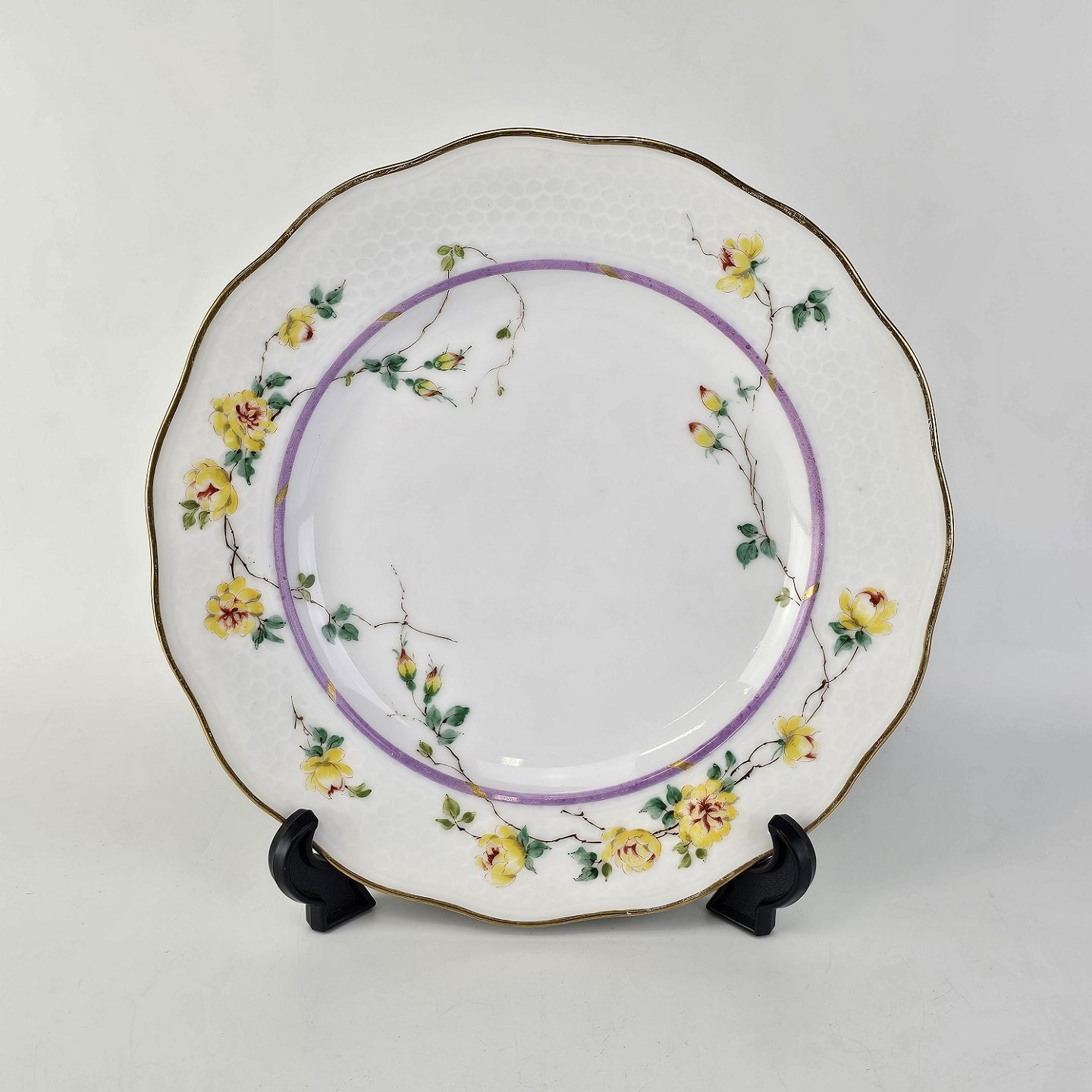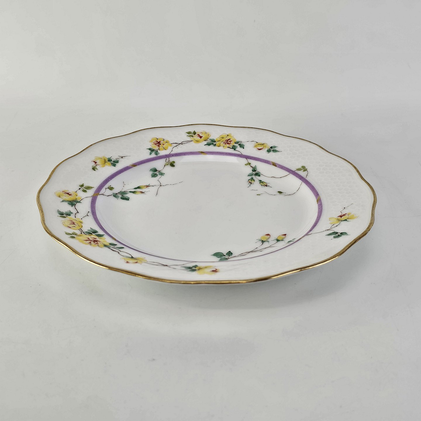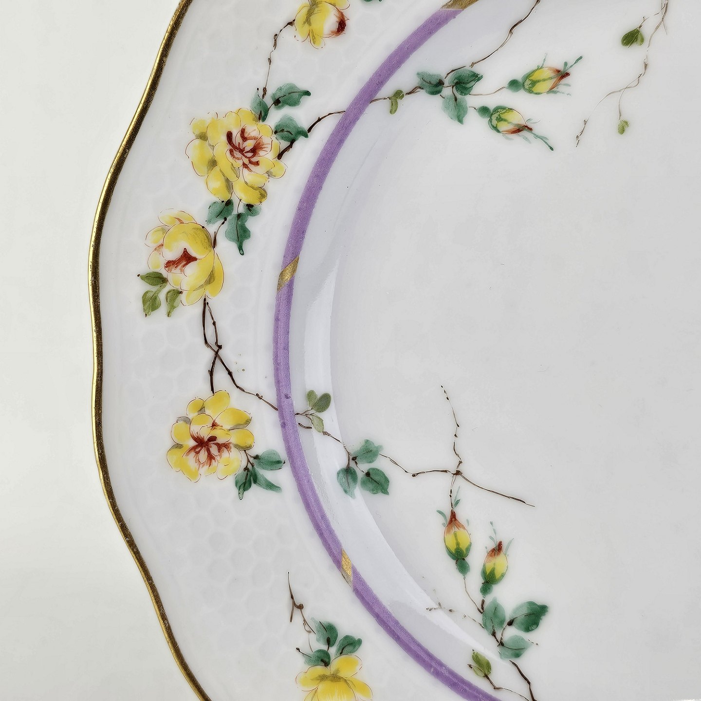 Service i hvidt porcelæn med hamret kantmønster dekoreret med gule blomsterranker og lyslilla streg. Stellet er med guldkant og det er mærket med bølger anvendt frem til 1890.