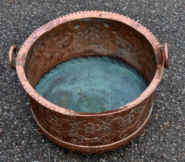 Firewood bucket, Haraldskjær Copper Factory, Vejle, 19th century. Denmark. With three legs and two handles. With intricately beaten decorations on the side. H.: 29 cm. Dia.: 40 cm. Perfect condition!