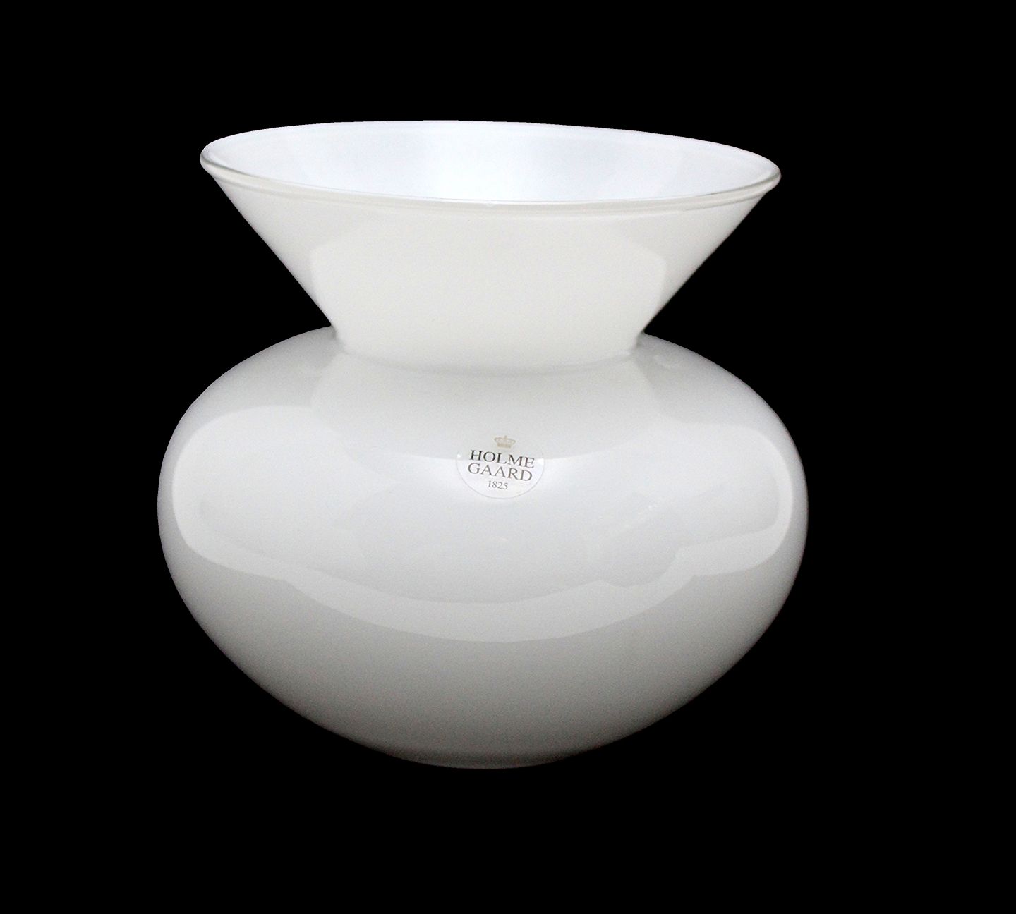 Text available in Danish: Holmegaard, Rokoko, Hvid opaline vase lav model, kugleformet korpus og tragtformet hals. Designet af Torben Jørgensen i 2006. Højde 13,5 cm. Diameter 14 cm. Øverste diameter 13 cm. Holmegaard label, ingen signatur. Pris: 375 kr. stk. Lager: 1