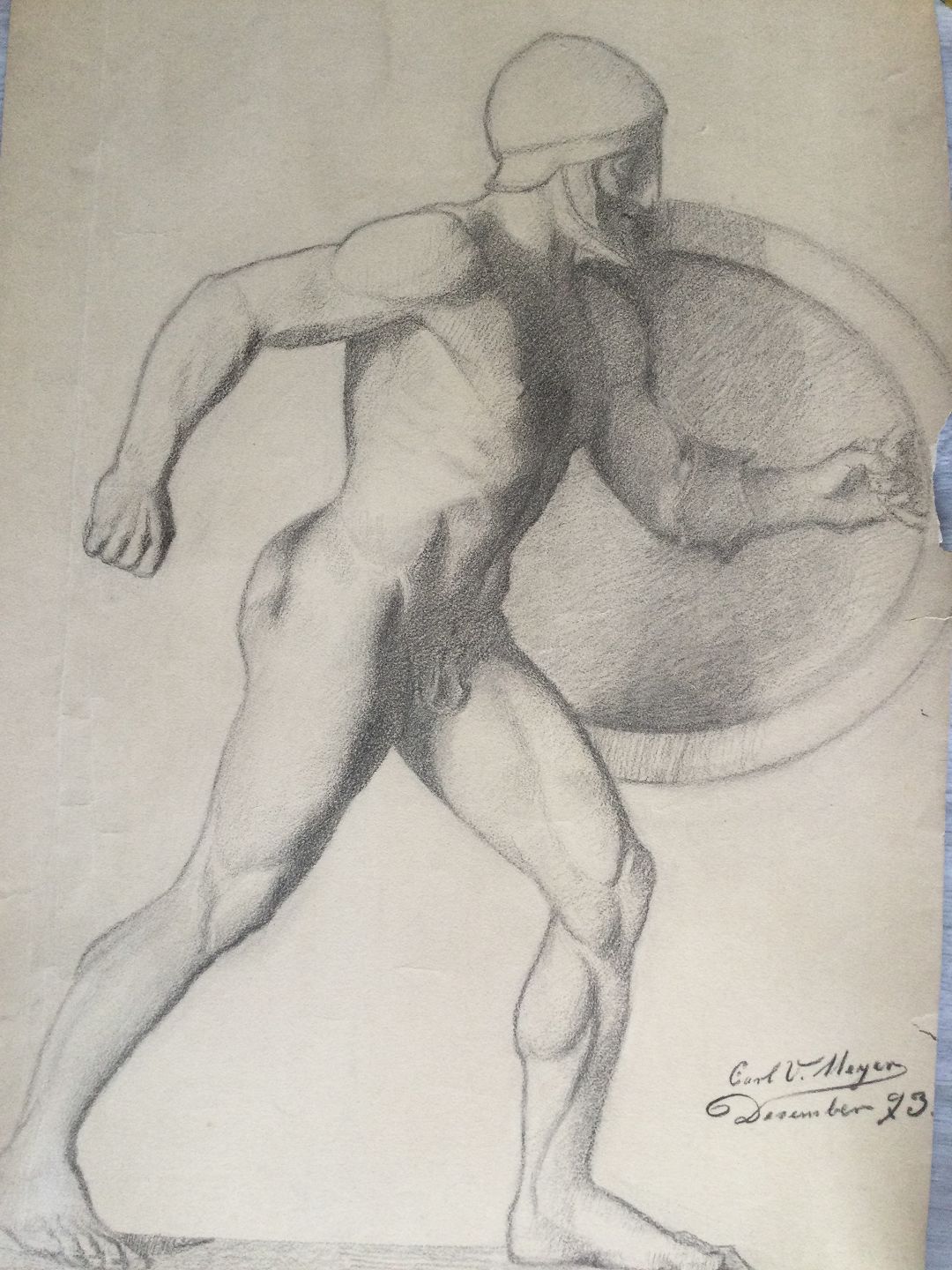 Text available in Danish: Akademitegning af Carl V. Meyer - Nøgen kriger med skjold 1893.
