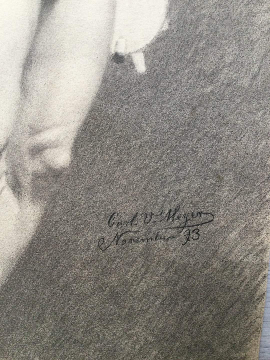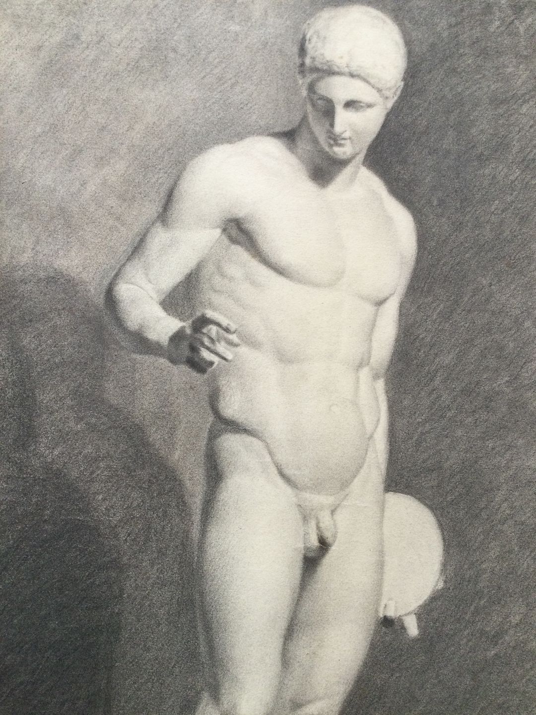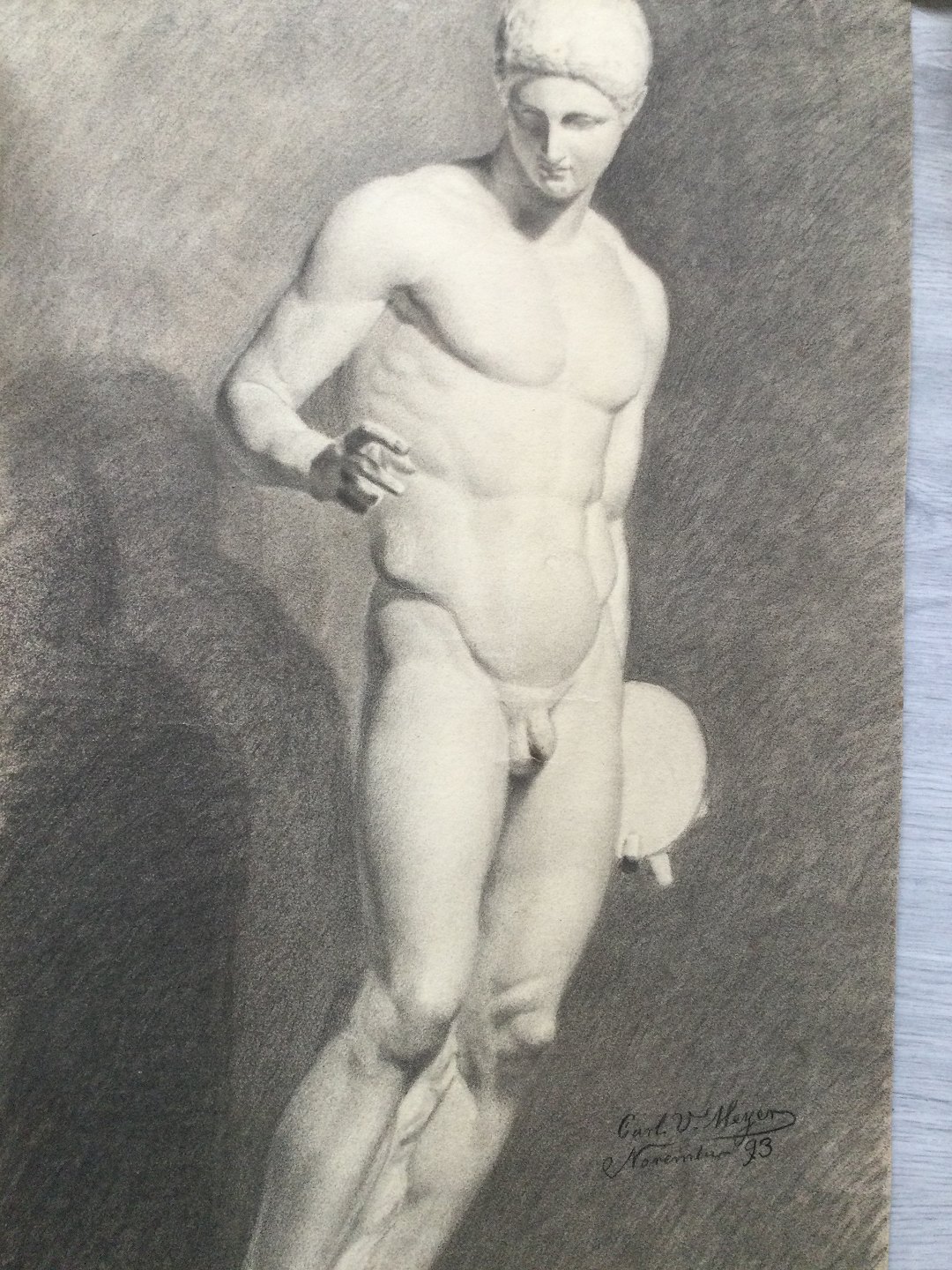 Text available in Danish: Akademitegning af Carl V. Meyer 1893 - Nøgen mand - Marmorskulptur - Diskoskasteren.
