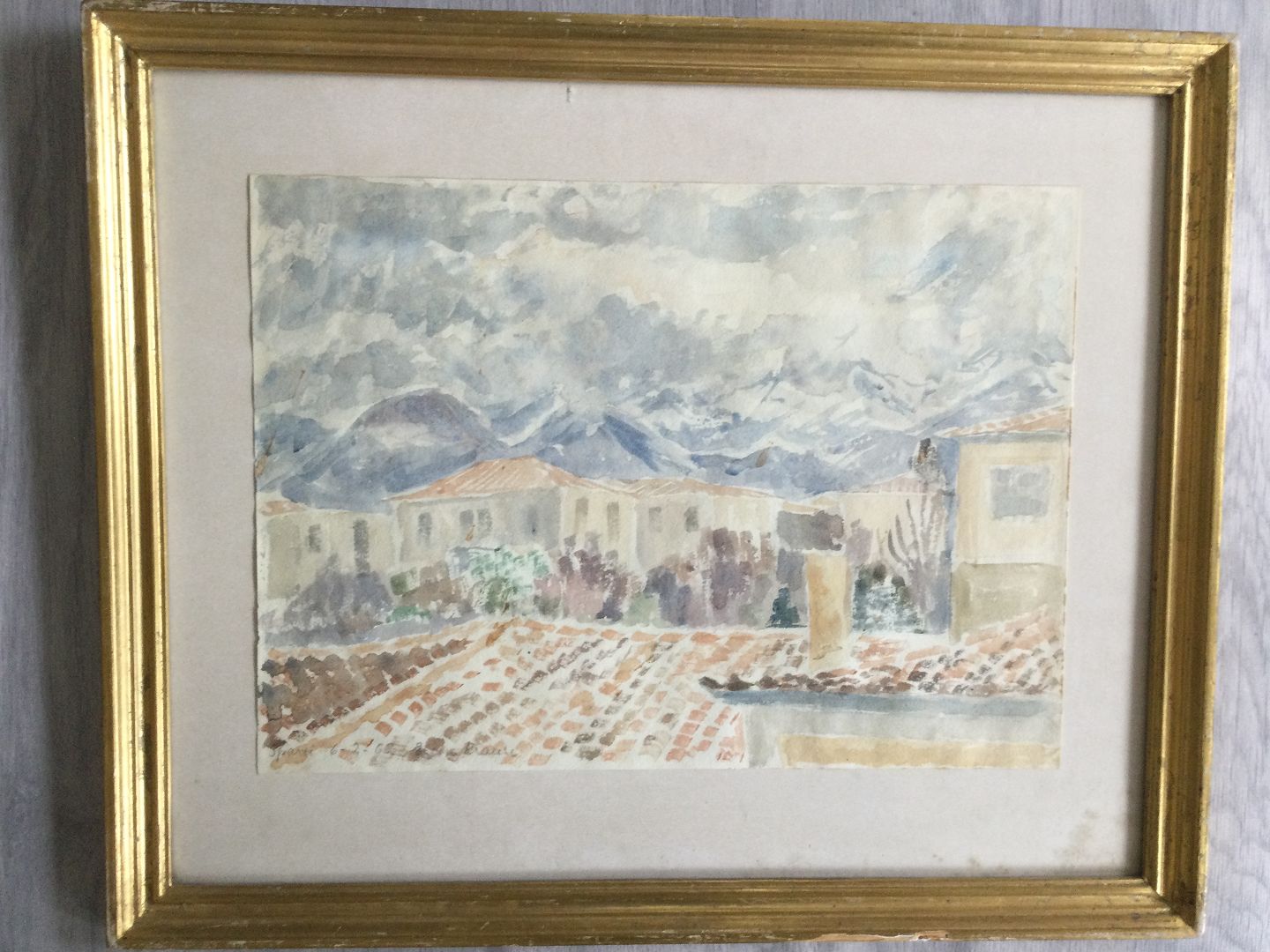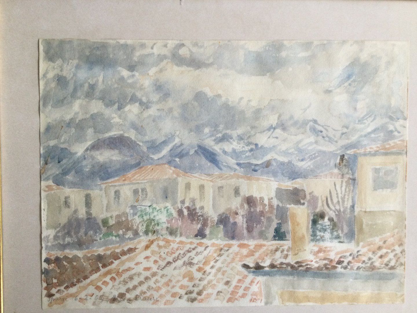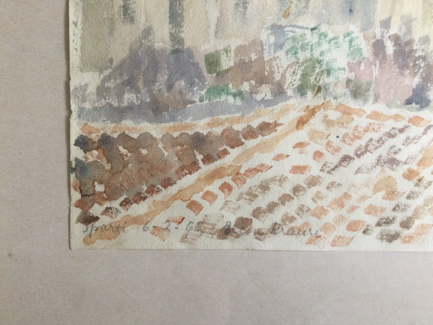 Text available in Danish: Akvarel af Ellen Krause Rørup - Parti fra Sparta 1962