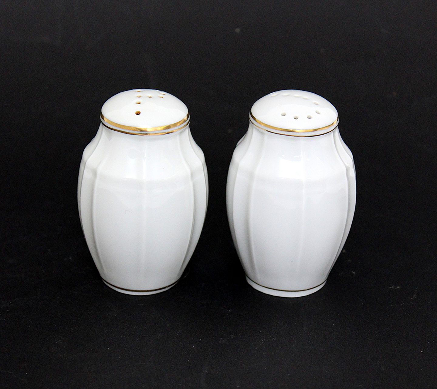 Text available in Danish: Bing & Grøndahl, Offenbach, Salt og Peber sæt. Hvidt kantet porcelæn med guld. Højde 7,5 cm. Salt og peber med original B&G propper. Pris: 375 kr. for sættet.