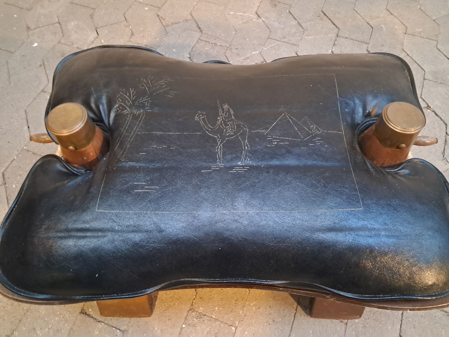 Skammel i massivt træ med kunstlæder hynde, fra 1980erne.