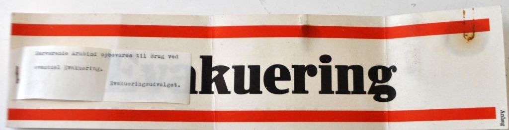 Evacuation armband in paper, 1940 - 1945, 2. WW. Denmark. 36 x 8.5 cm. With attached paper note with the text: This armband is kept for use in case of possible Evacuation. Evacuation Committee.