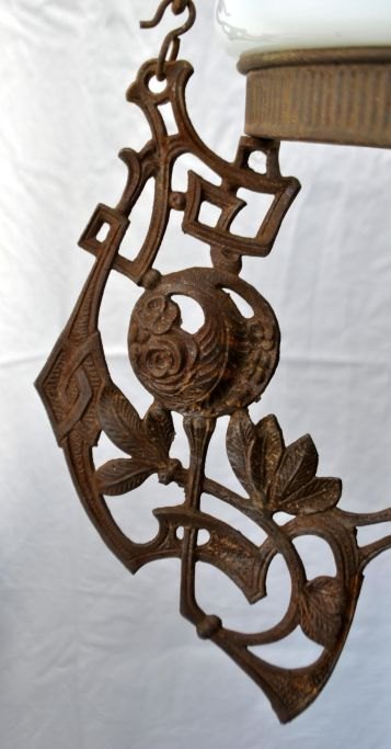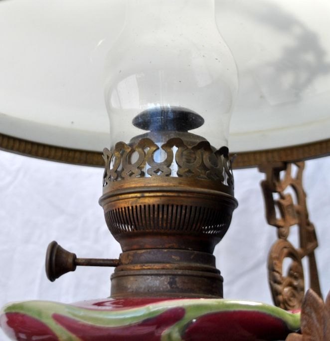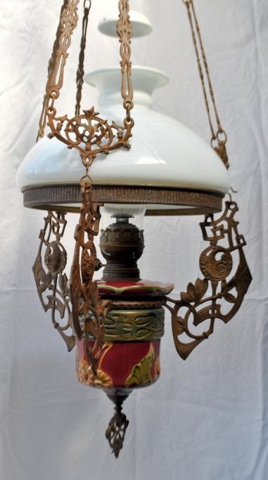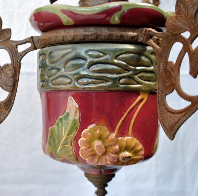 Petroleum hanging lamp with majolica, 19th century. Majolica faience in plum color with flowers. Iron hooks decorated with rose branches. With fire glass. White glass shade dia: 35 cm. L. incl. hook: 108 cm. Dia: 40 cm.