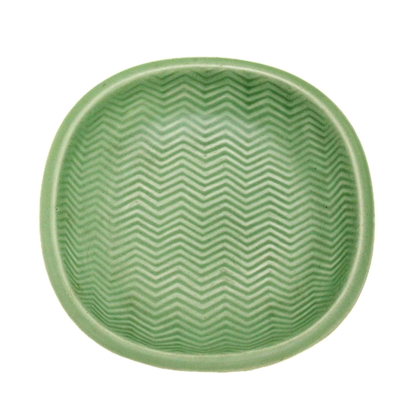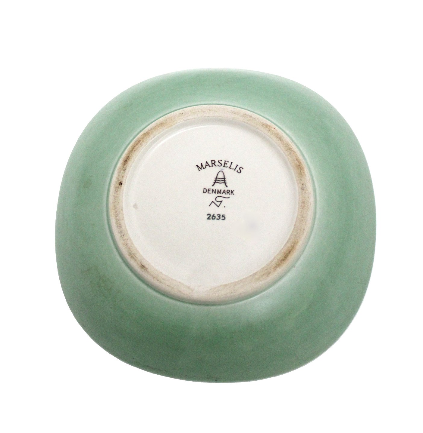 Text available in Danish: Aluminia, Marselis, kunststengods, Mintgrøn fad med siksakmønster. Designet af Nils Thorsson i perioden 1953-1960. Nr. 2635. Højde 4,5 cm. 18 x 18 cm. Rimelig stand med brugsspor og enkelte overfladekrakeleringer. Pris: 300 kr. stk. Lager: 1