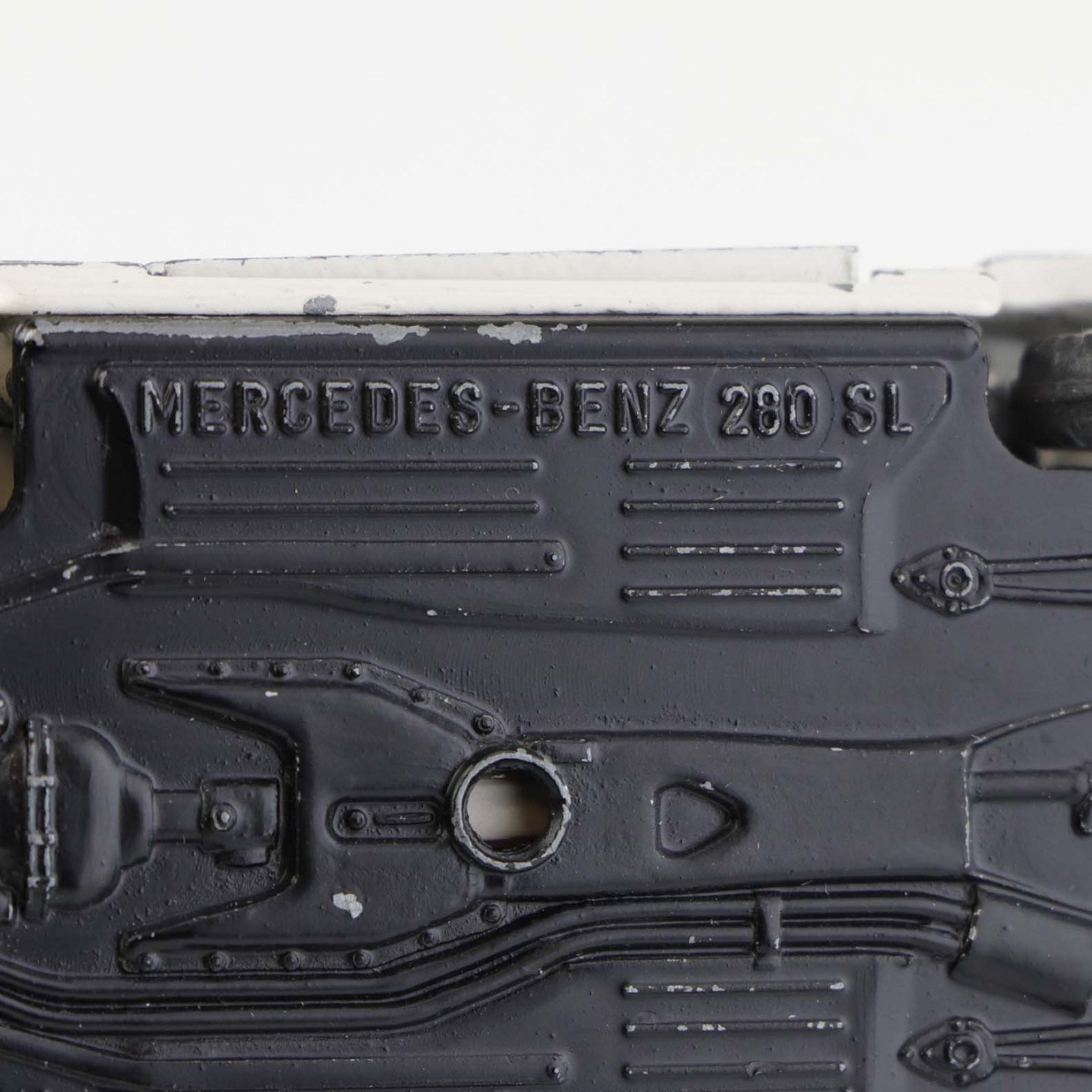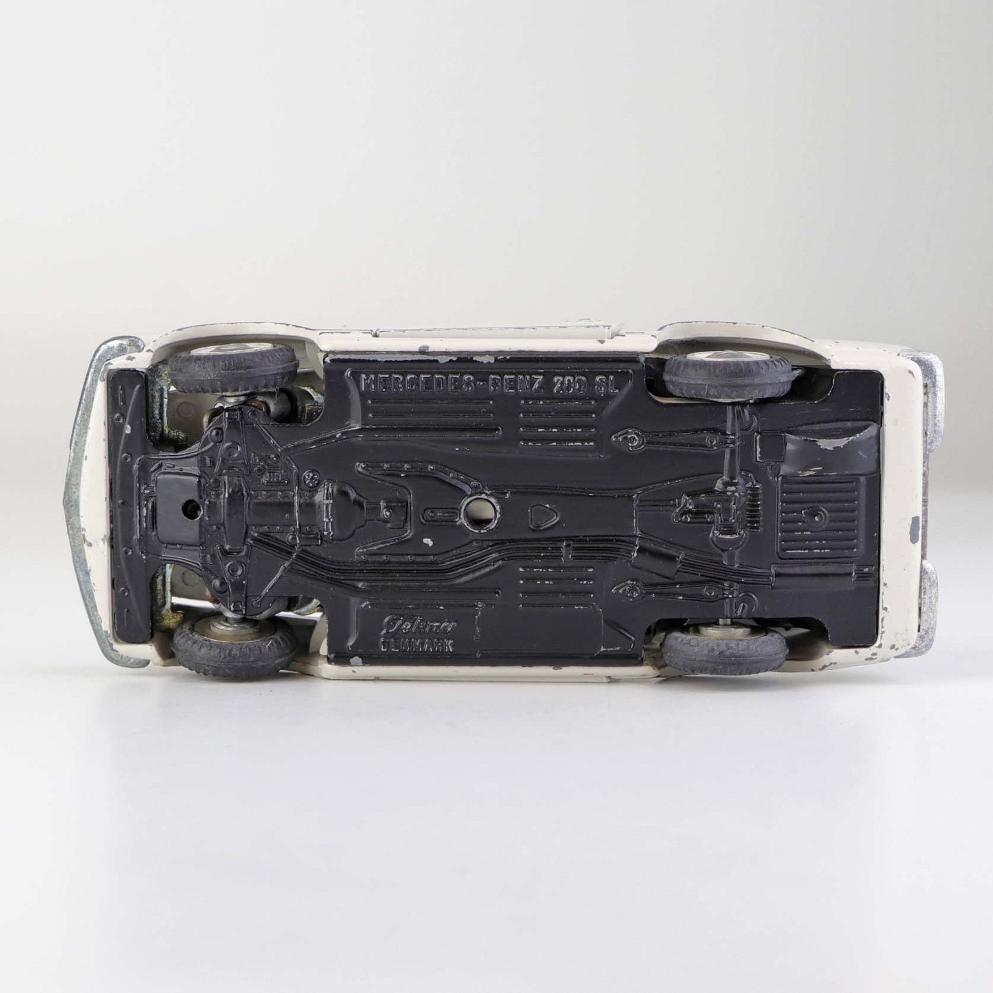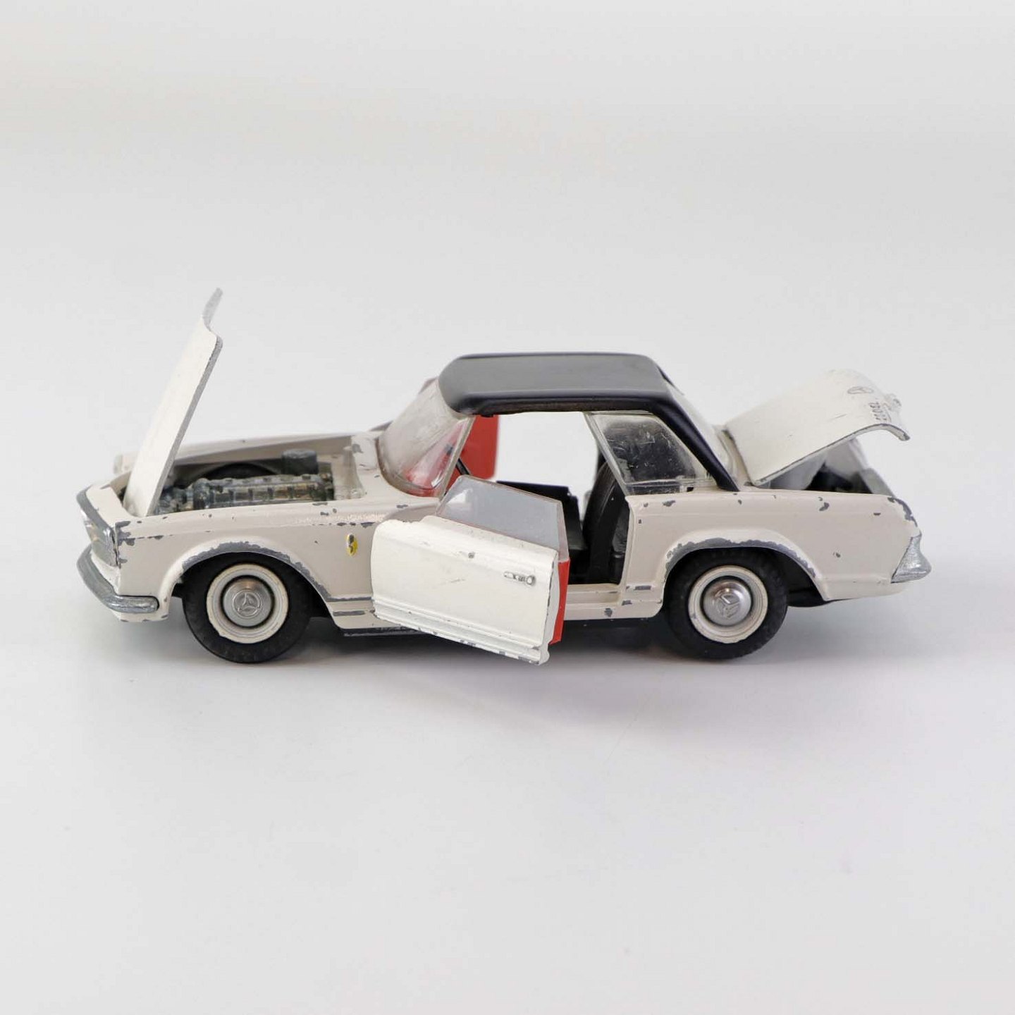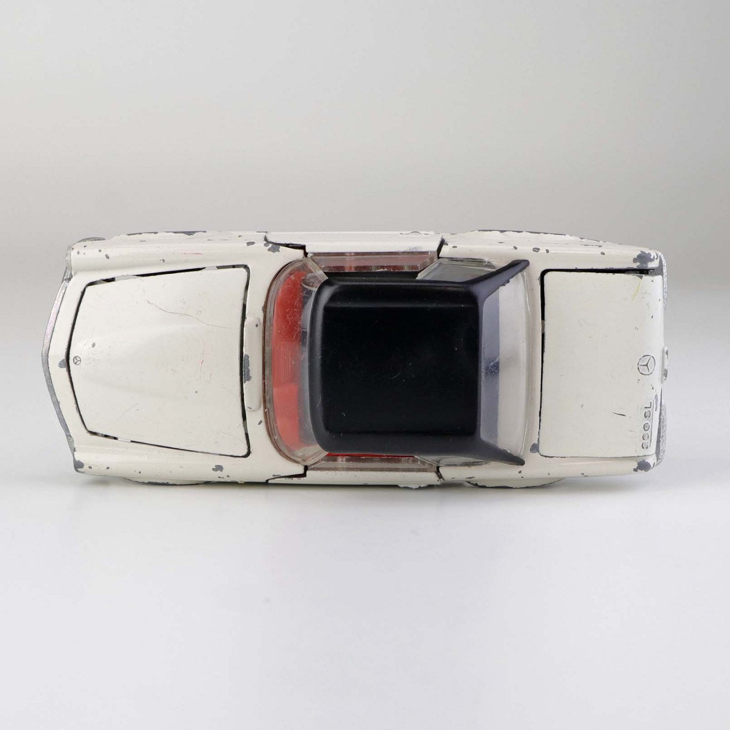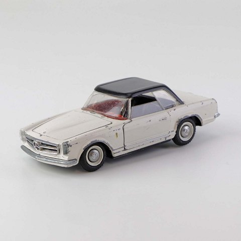 Text available in Danish: Hvid Mercedes-Benz 280 SL legetøjsbil med sort tag i lakeret metal med gummi hjul. Motorhjelm, bagklap og begge frontdører kan åbnes.
