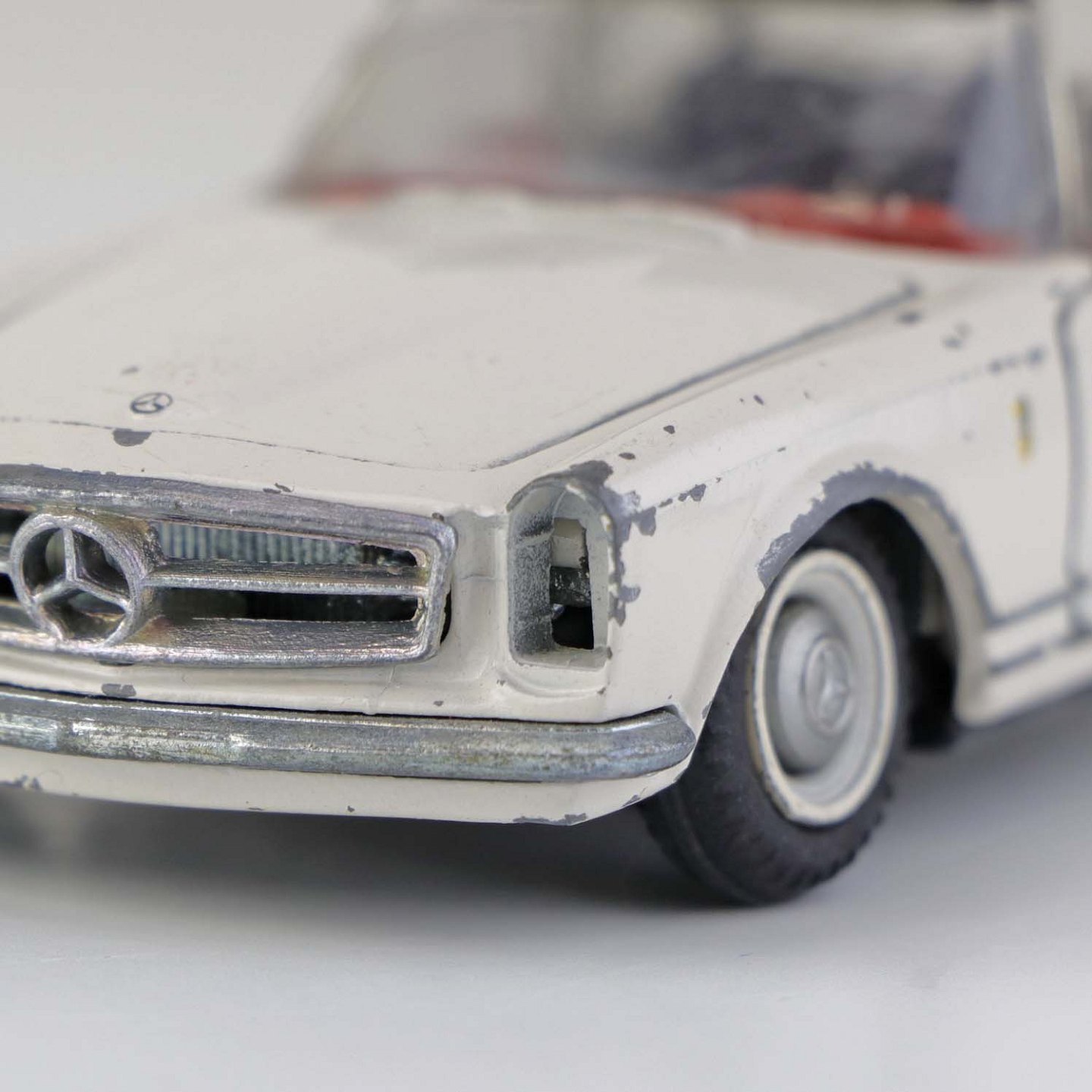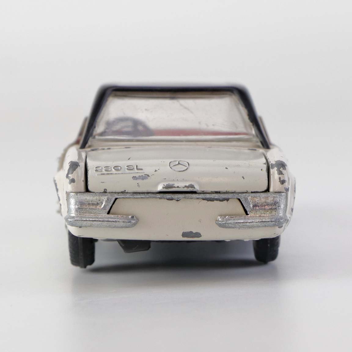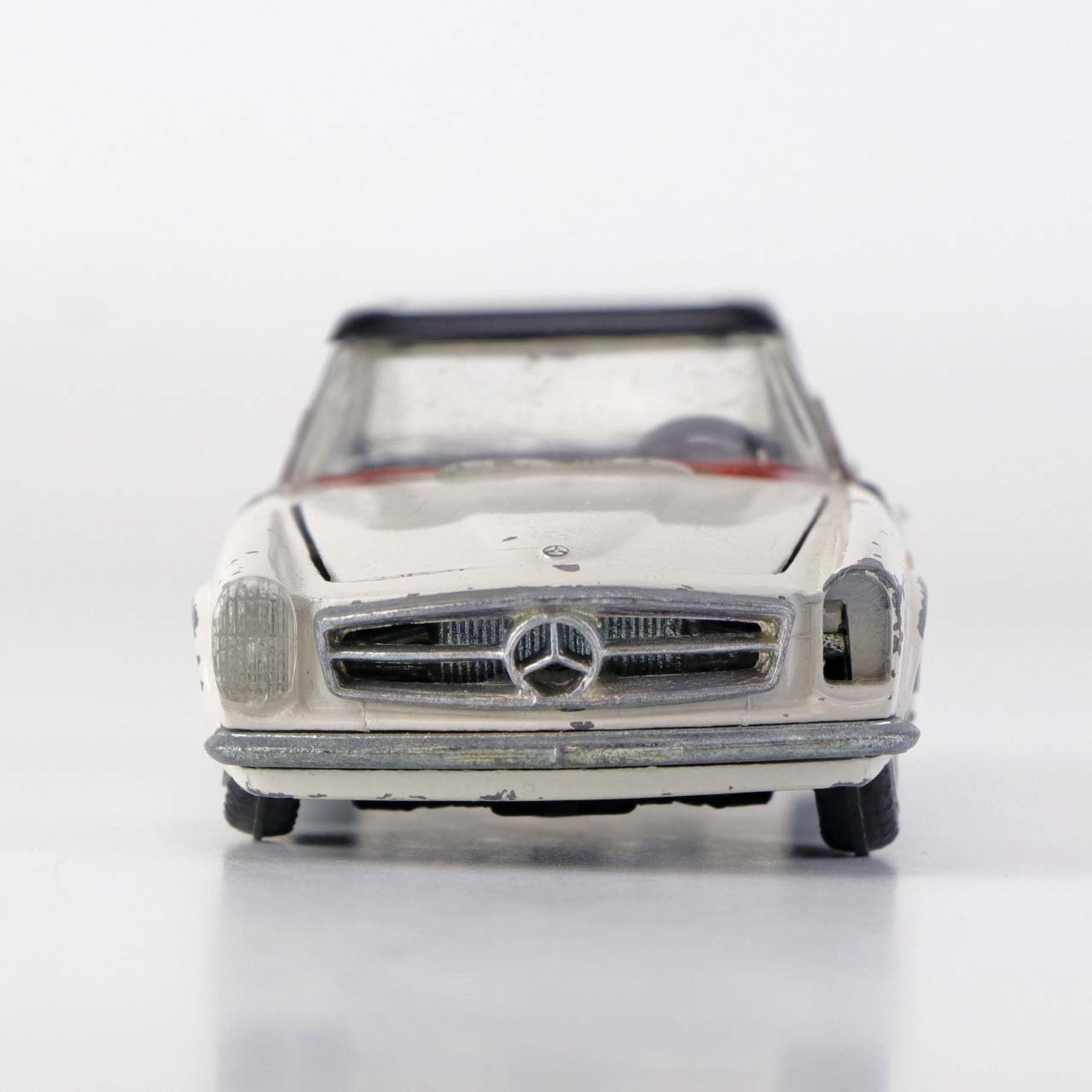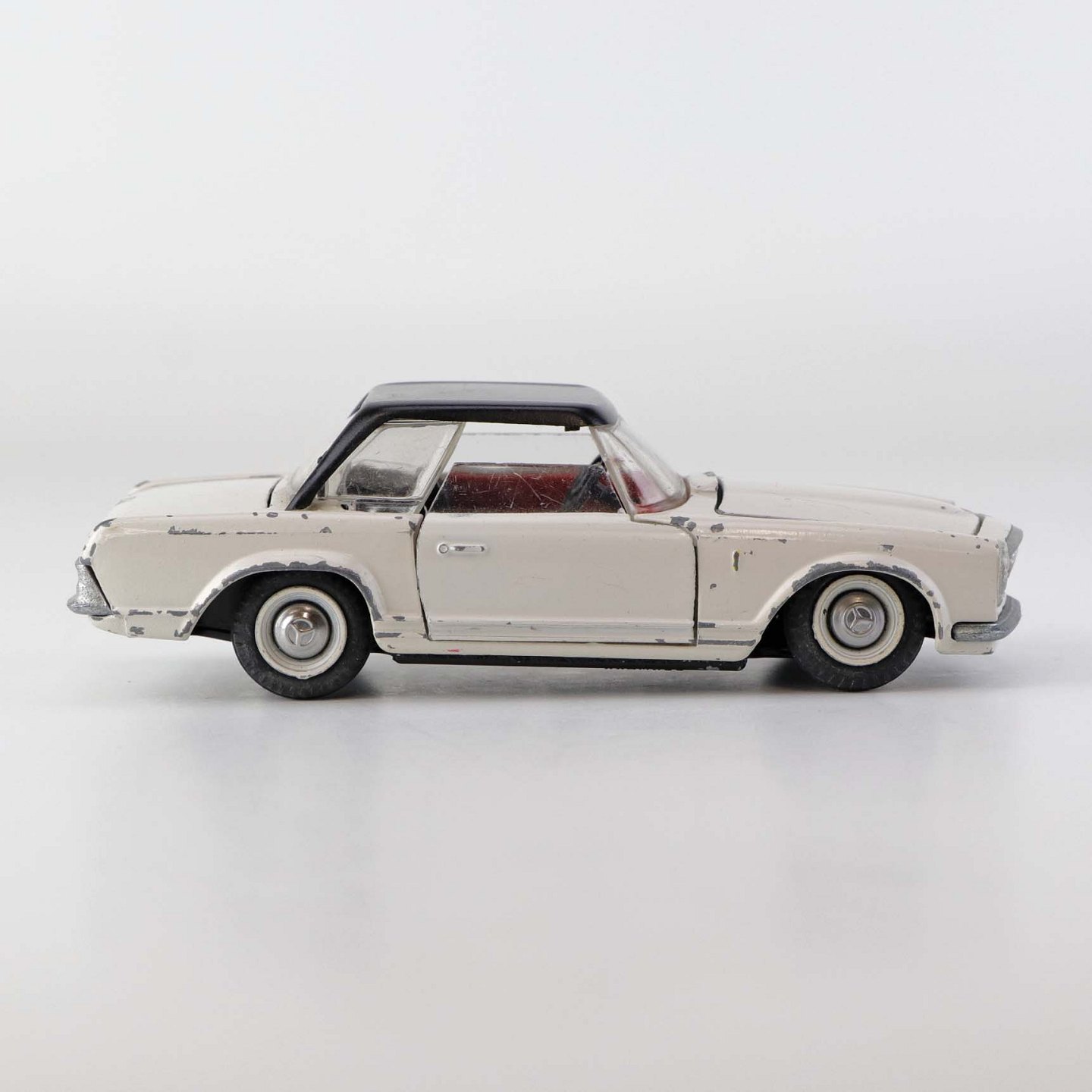 Text available in Danish: Hvid Mercedes-Benz 280 SL legetøjsbil med sort tag i lakeret metal med gummi hjul. Motorhjelm, bagklap og begge frontdører kan åbnes.