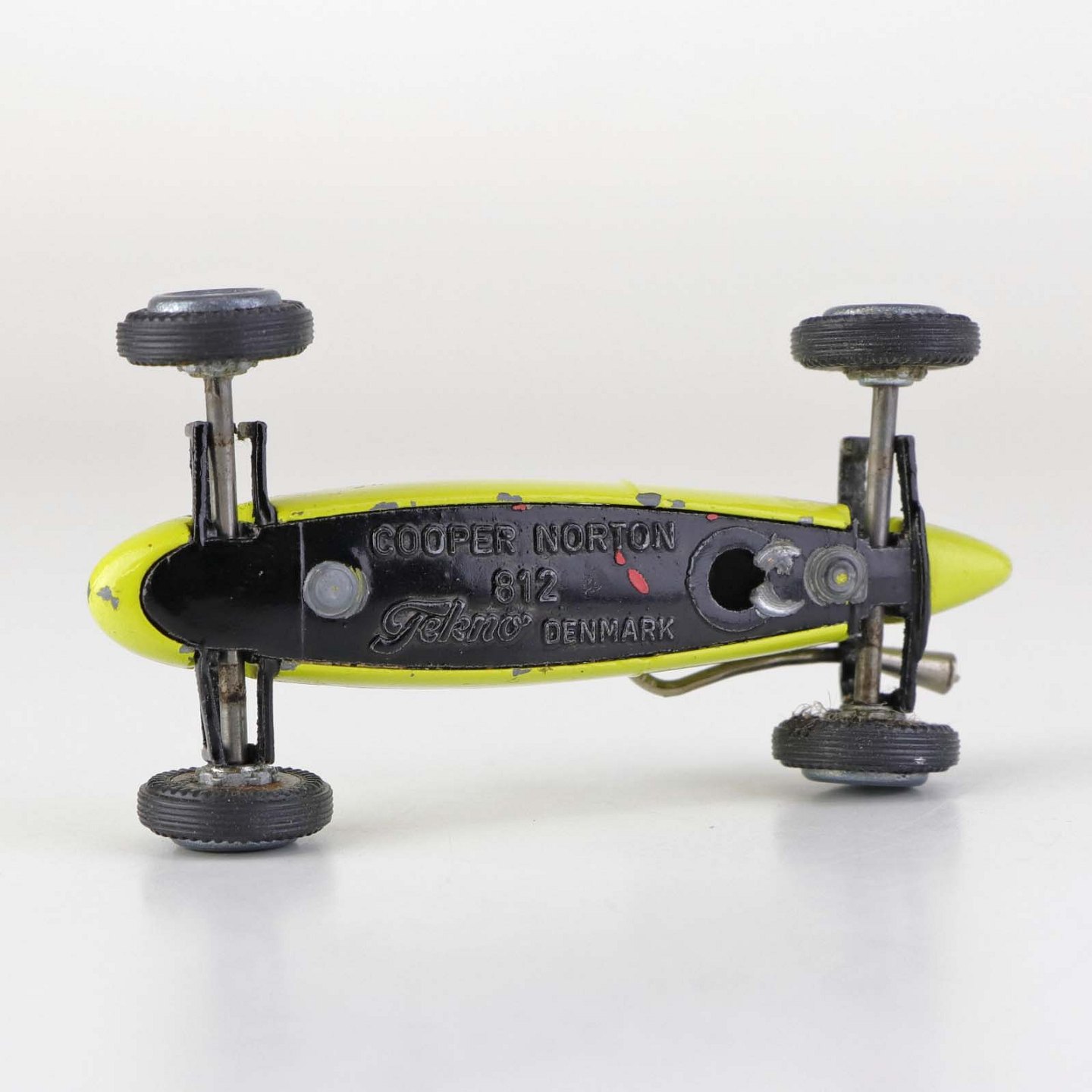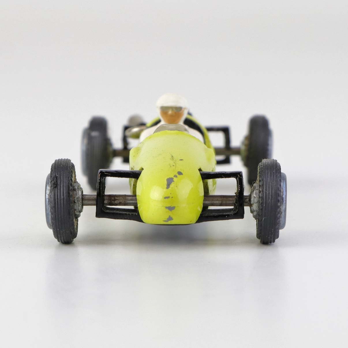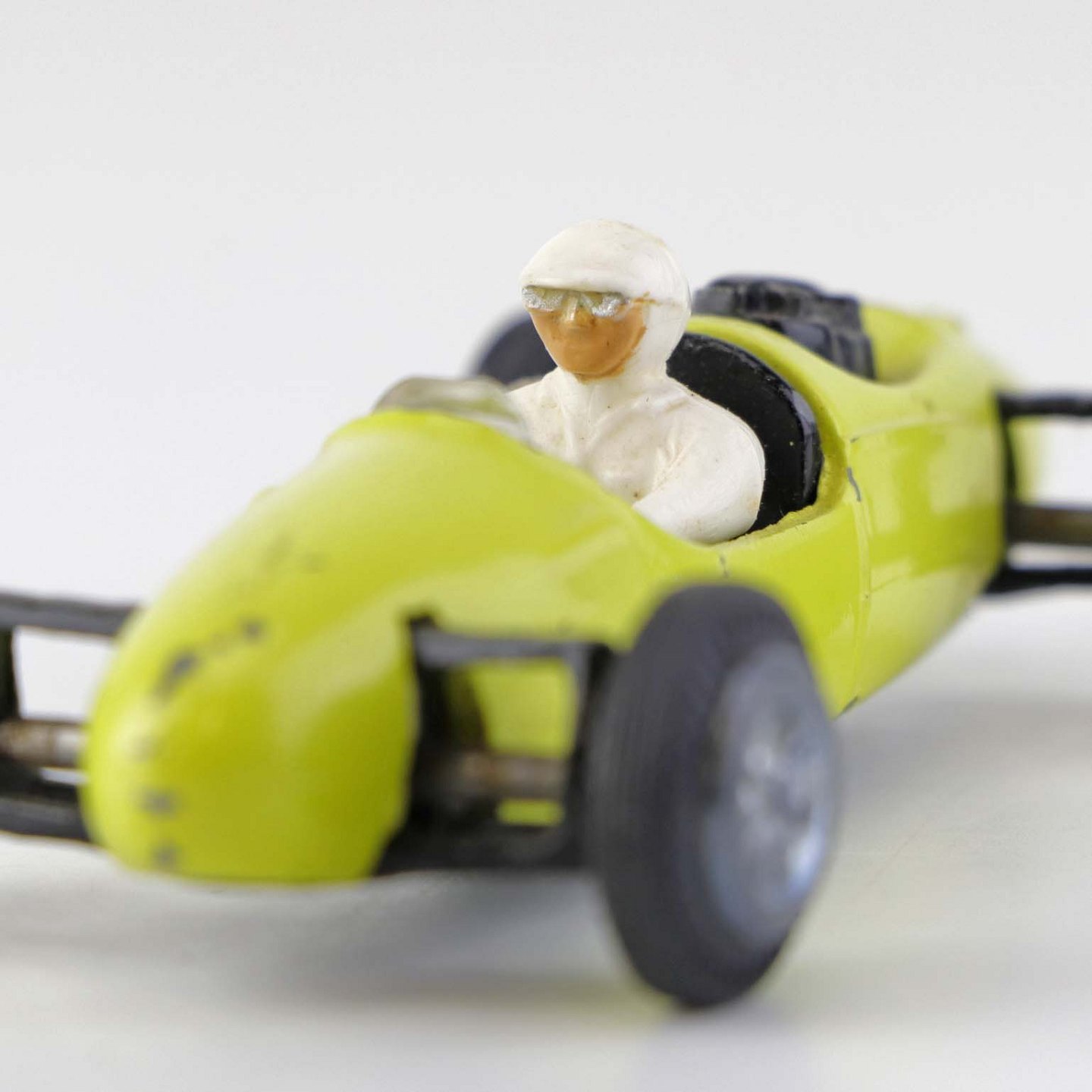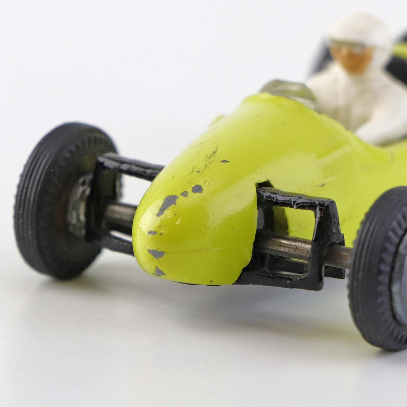 Cooper Norton legetøjsbil med fører bag rattet i gul lakeret metal med gummi hjul. Nr. 812