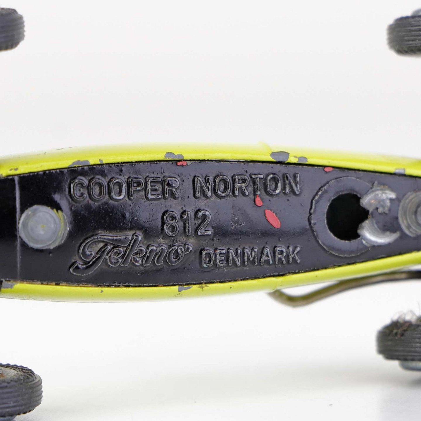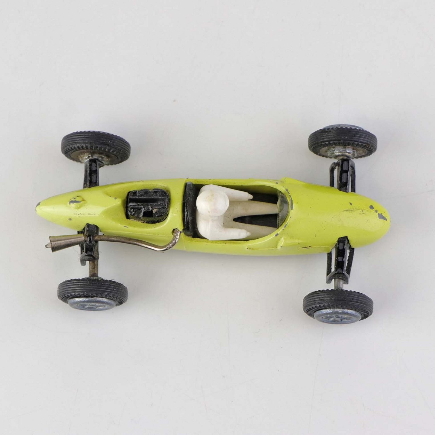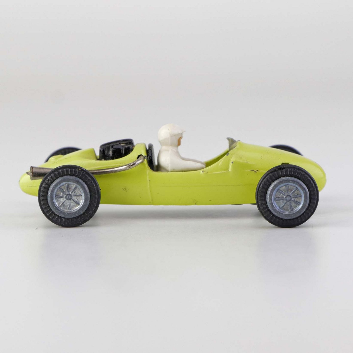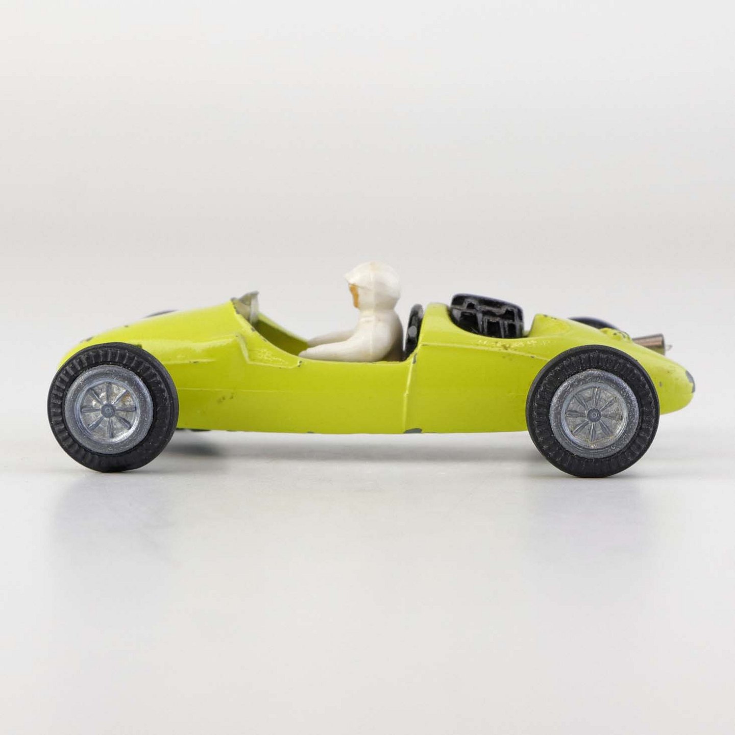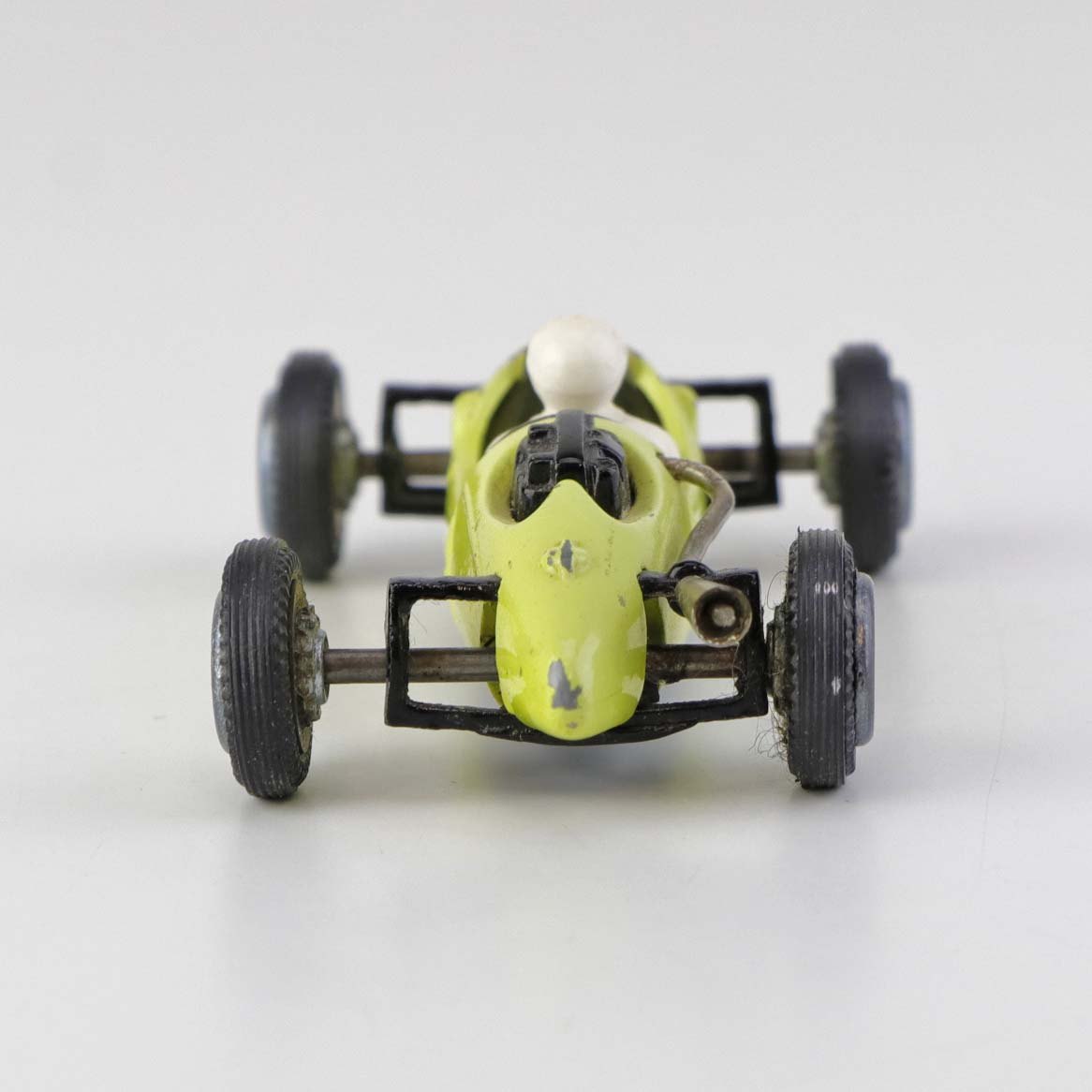 Cooper Norton legetøjsbil med fører bag rattet i gul lakeret metal med gummi hjul. Nr. 812
