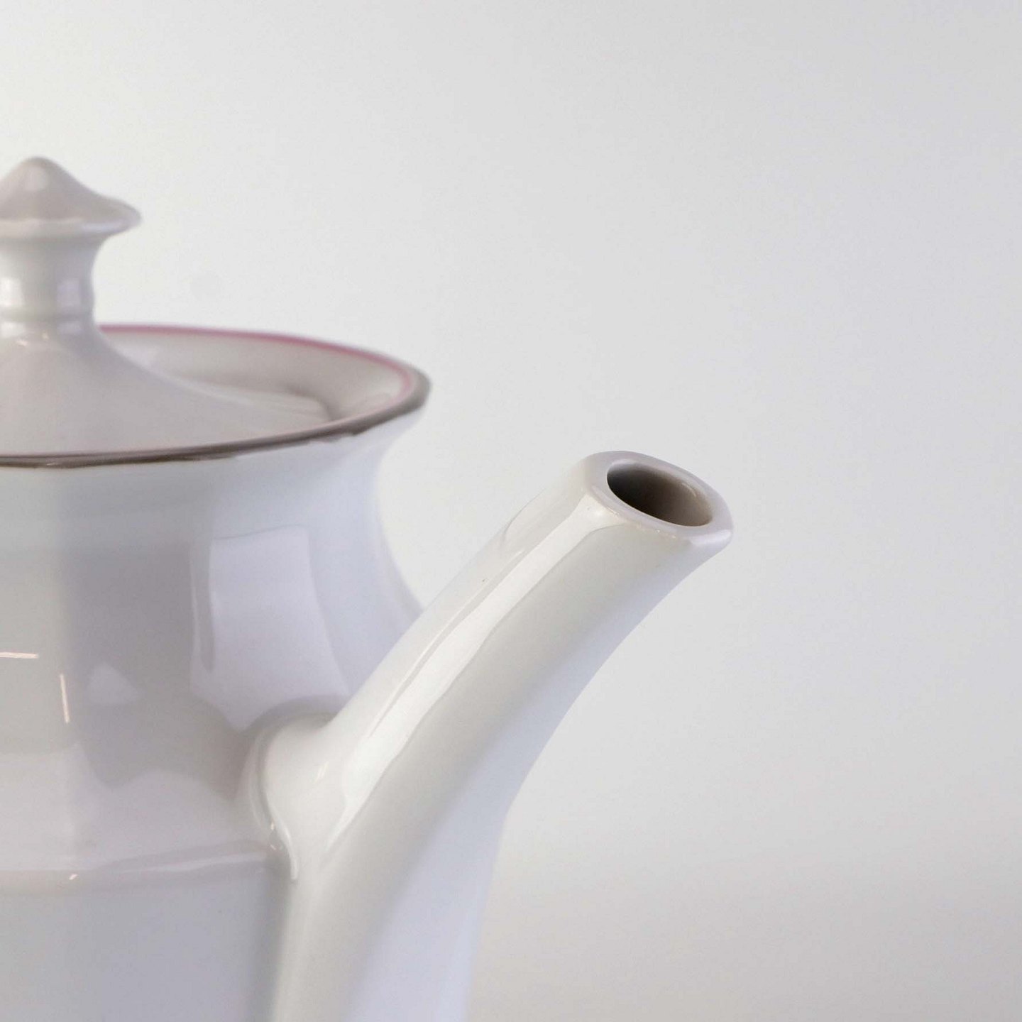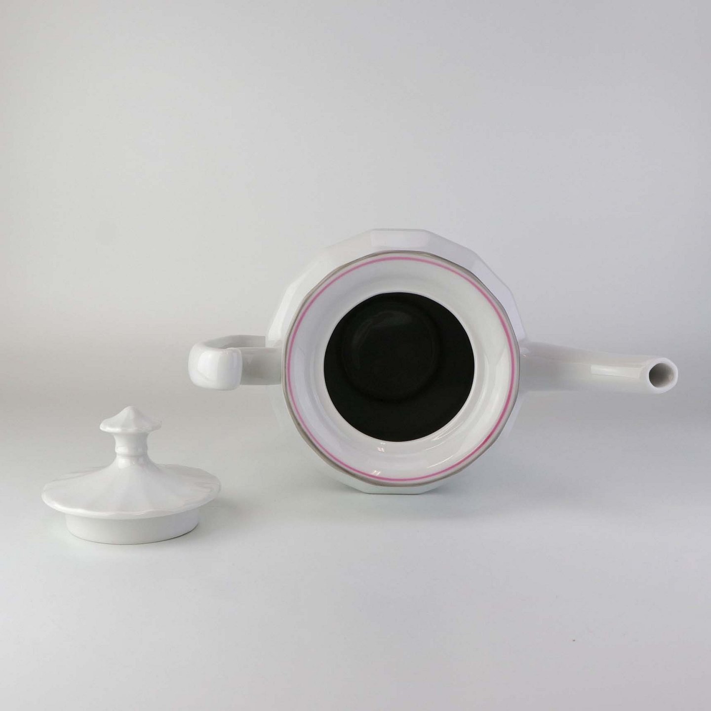 Service i kantet hvidt porcelæn dekoreret med lyserød og grå stribe ved kant.