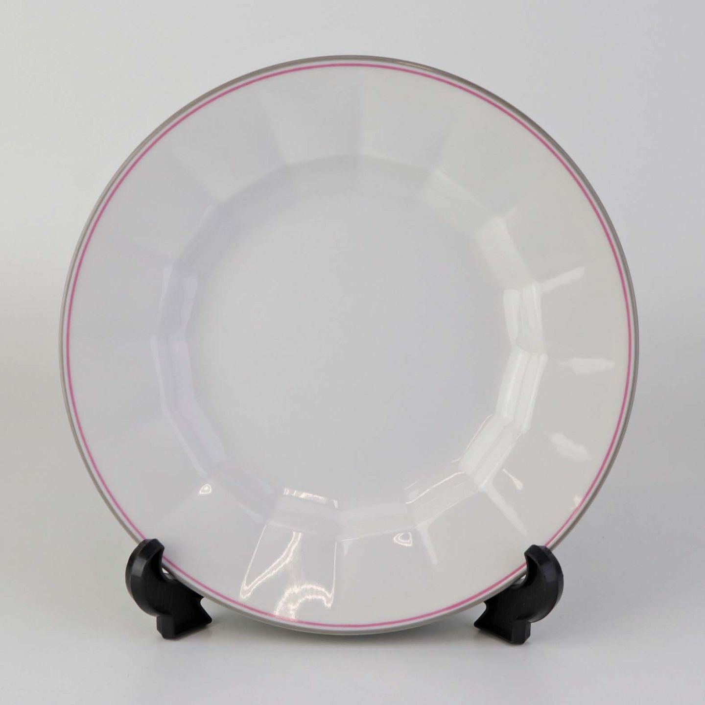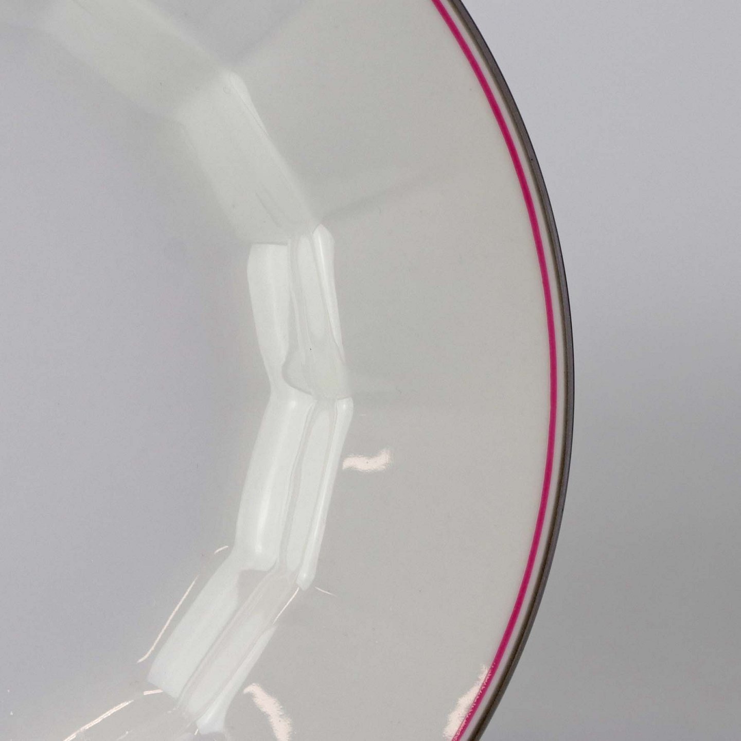 Service i kantet hvidt porcelæn dekoreret med lyserød og grå stribe ved kant.