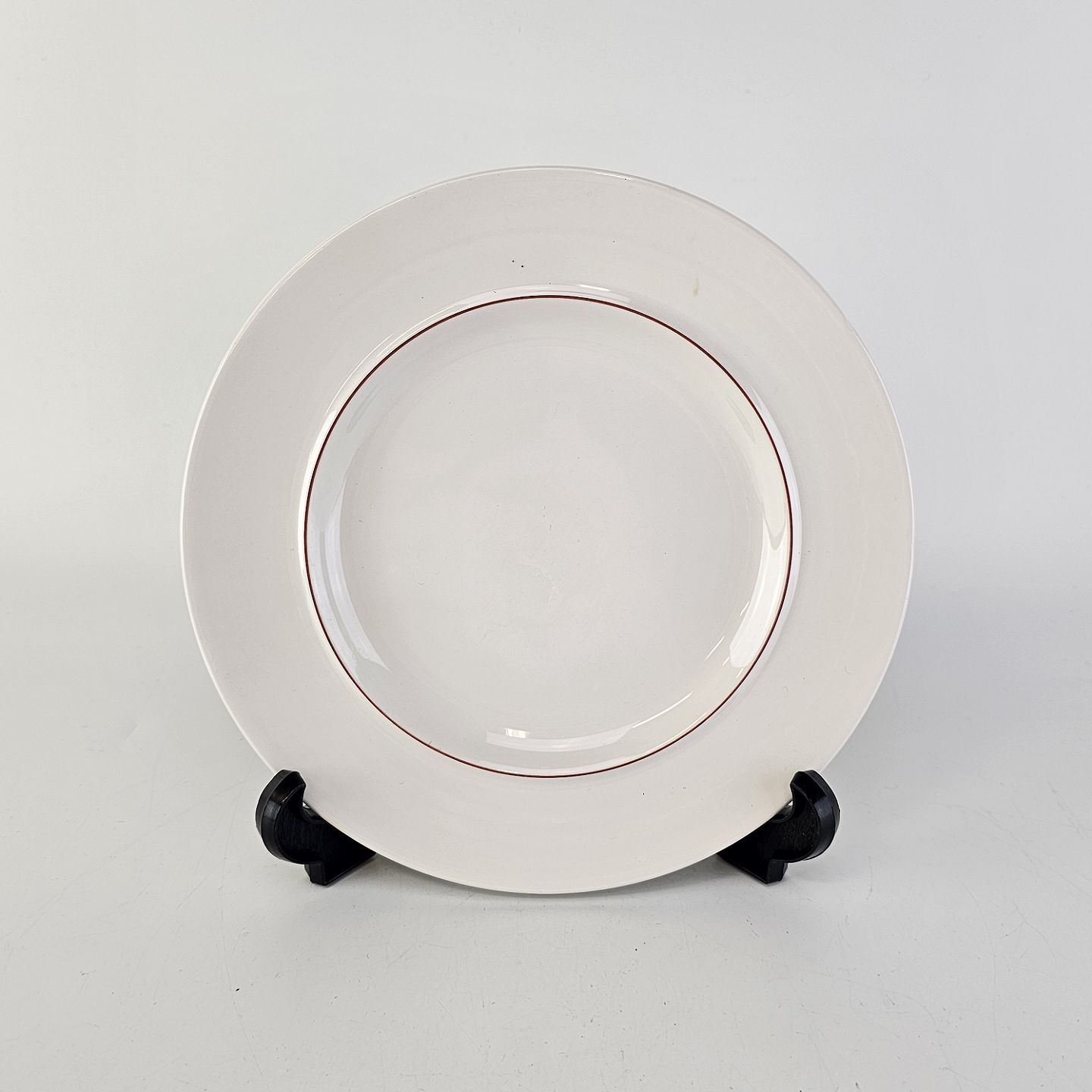 Stellet er fremstillet i glat hvid fajance med dekoration af en simpel stribe i forskellige farver