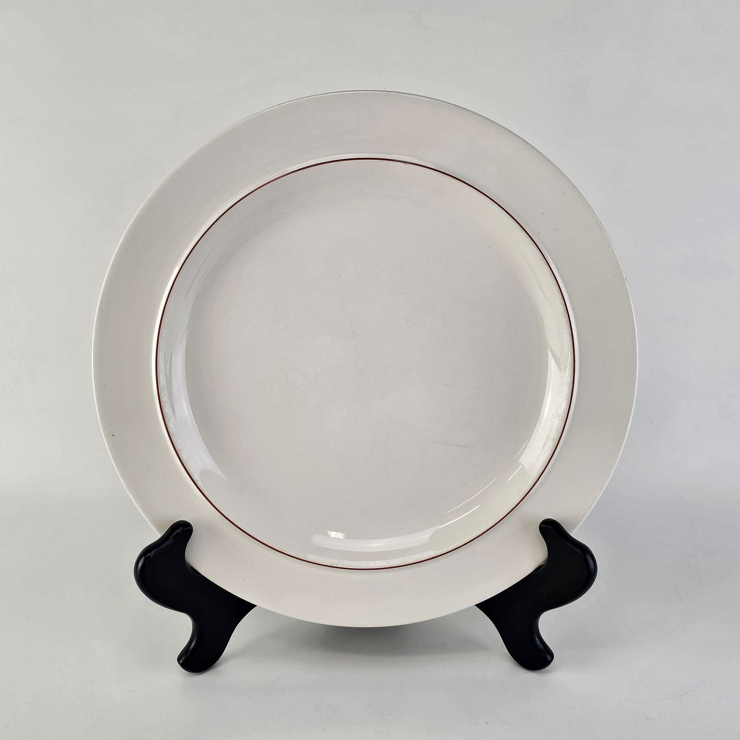 Stellet er fremstillet i glat hvid fajance med dekoration af en simpel stribe i forskellige farver