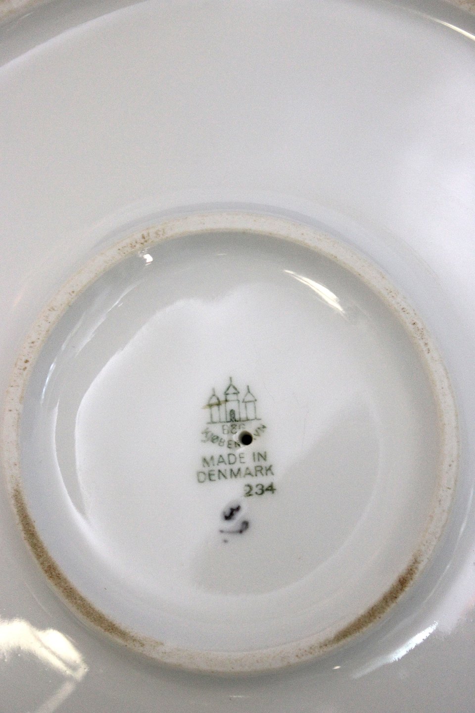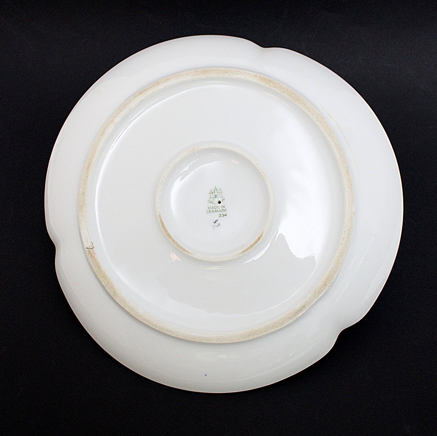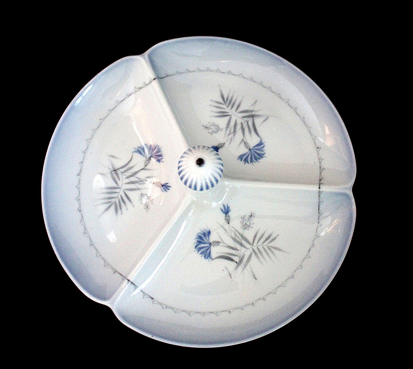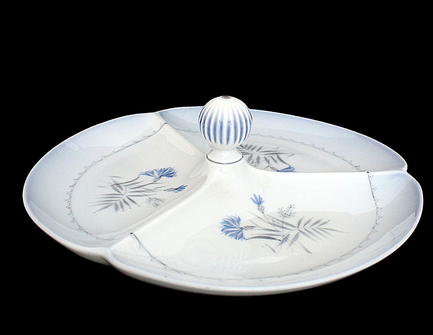Text available in Danish: Bing & Grøndahl, Demeter, blå tone. Cabaretfad, Kabaretfad, meget sjælden. Inddelt med 3 rum og knop som håndtag. Nr. 234. Højde 10cm. Diameter 27 cm. Pris: 1150 kr. stk. Lager: 1