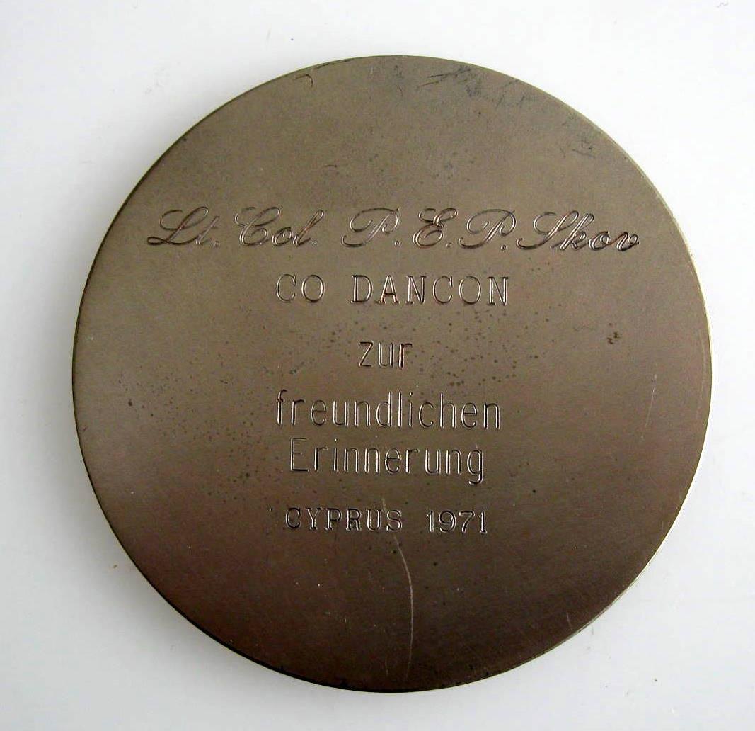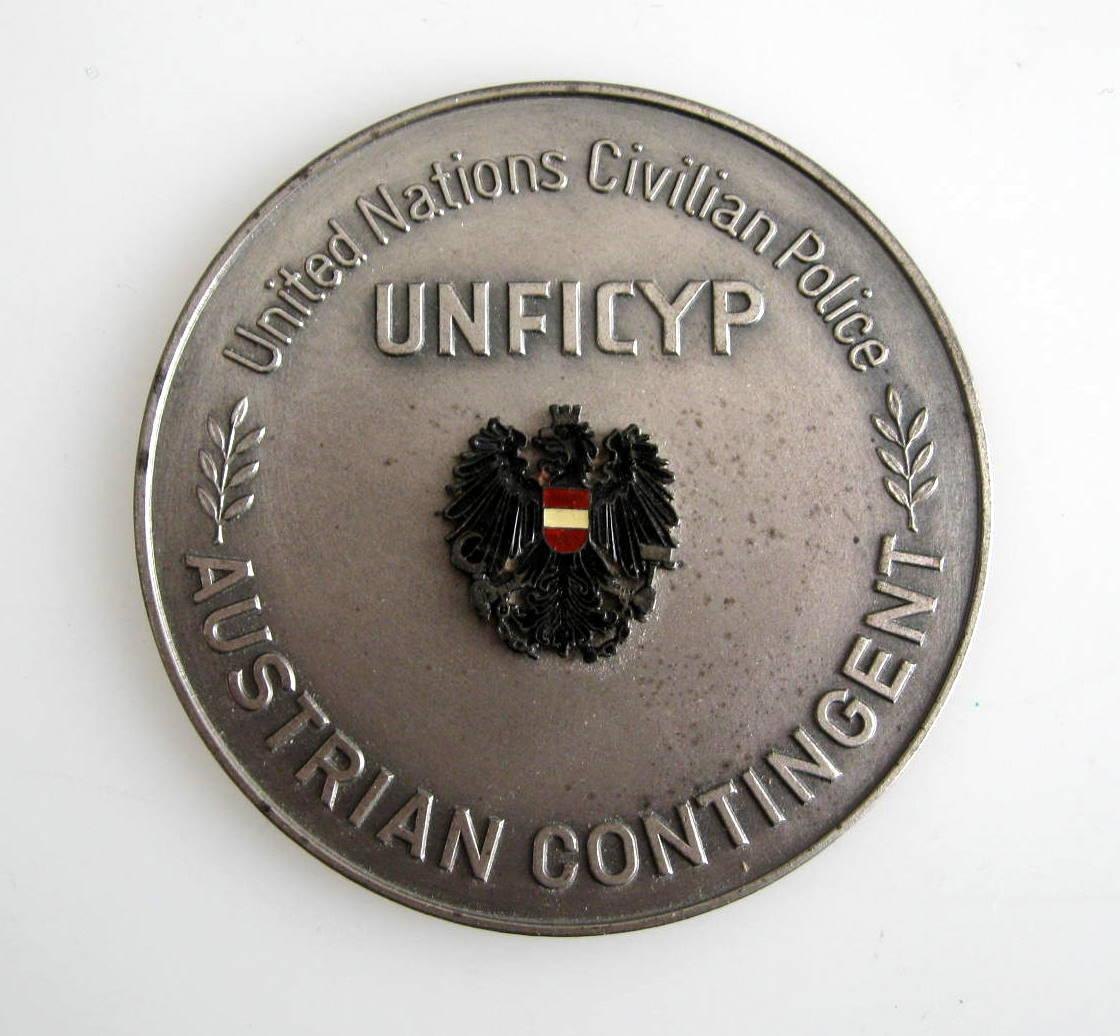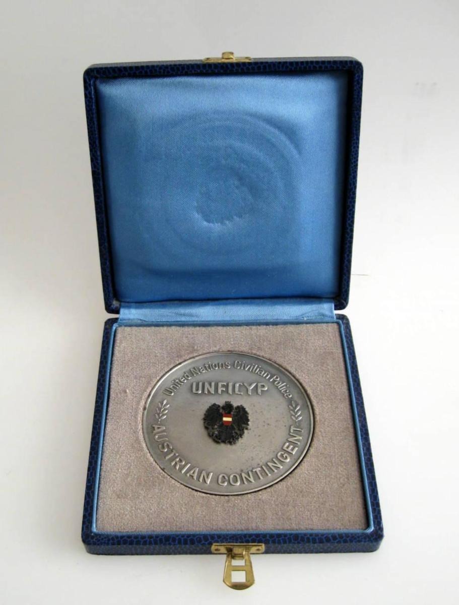 United Nations Medal - United Nations Civilian Police - Unficyp. Austrian Contingent. Dia.: 7.5 cm. Metal with enamel. With inscription: Lt. Col. PEP Skov CO DANCON zur freundlichen Erinnerung, CYPRUS 1971. In orignial box. Provenance: Colonel Lieutenant Poul Ervin O. Skov, Supreme Commander Dancon XIV, Cyprus.