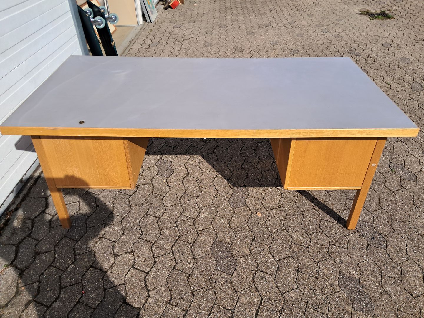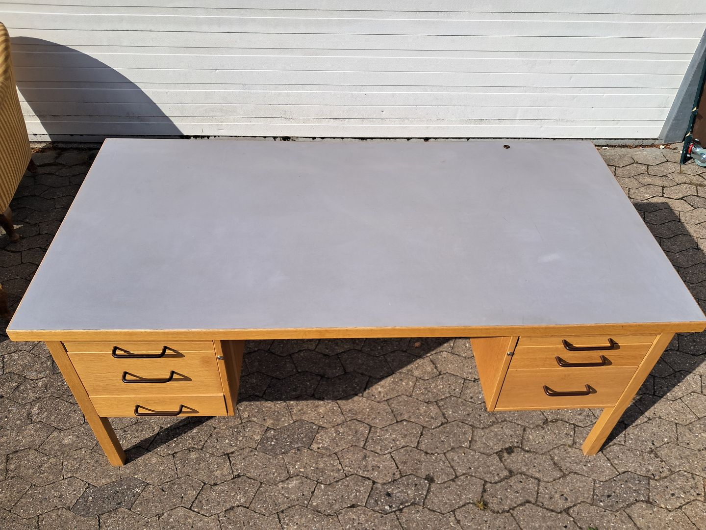 Skrivebord i egetræ med linoleumsplade, fra 1980erne.