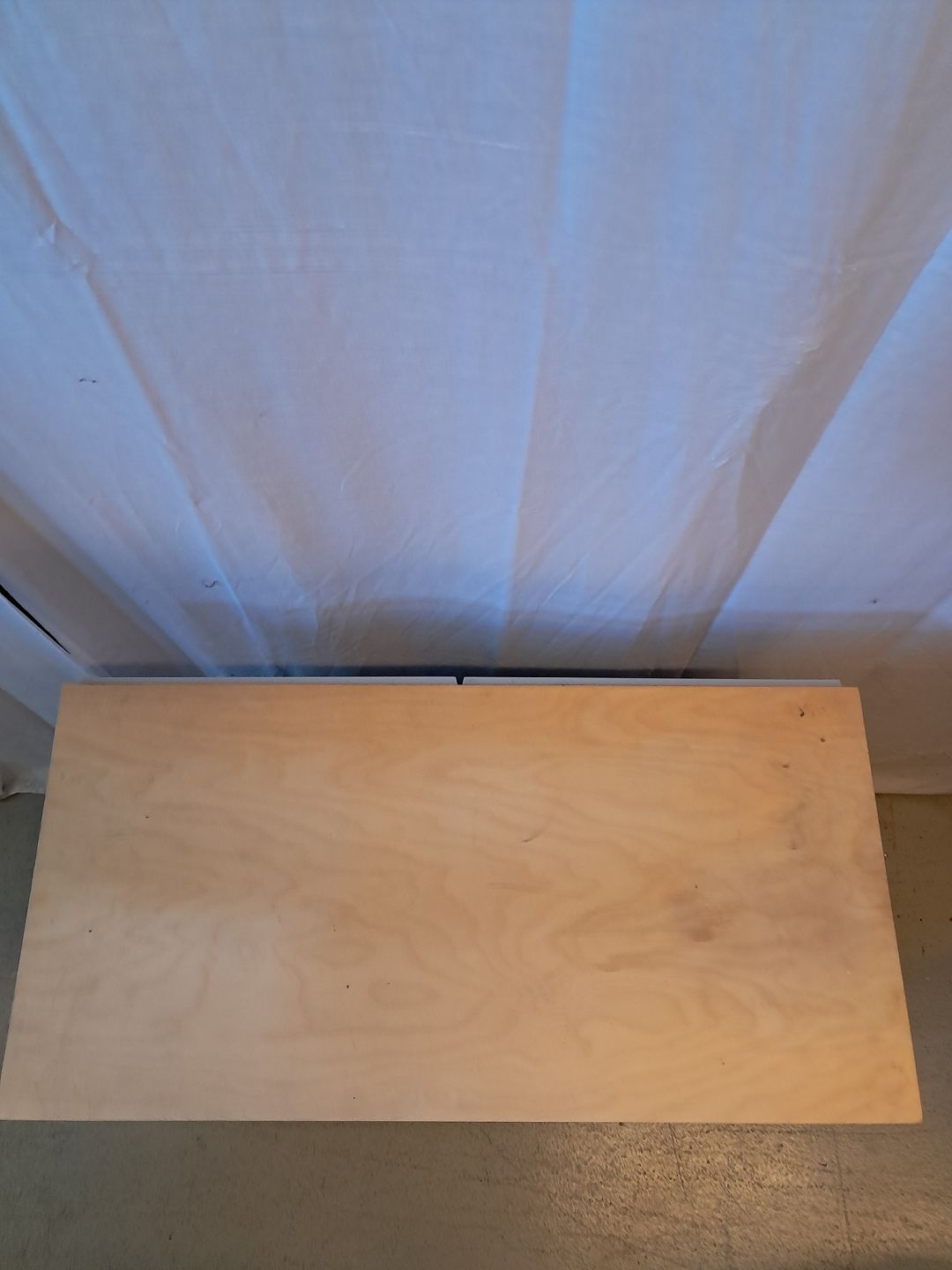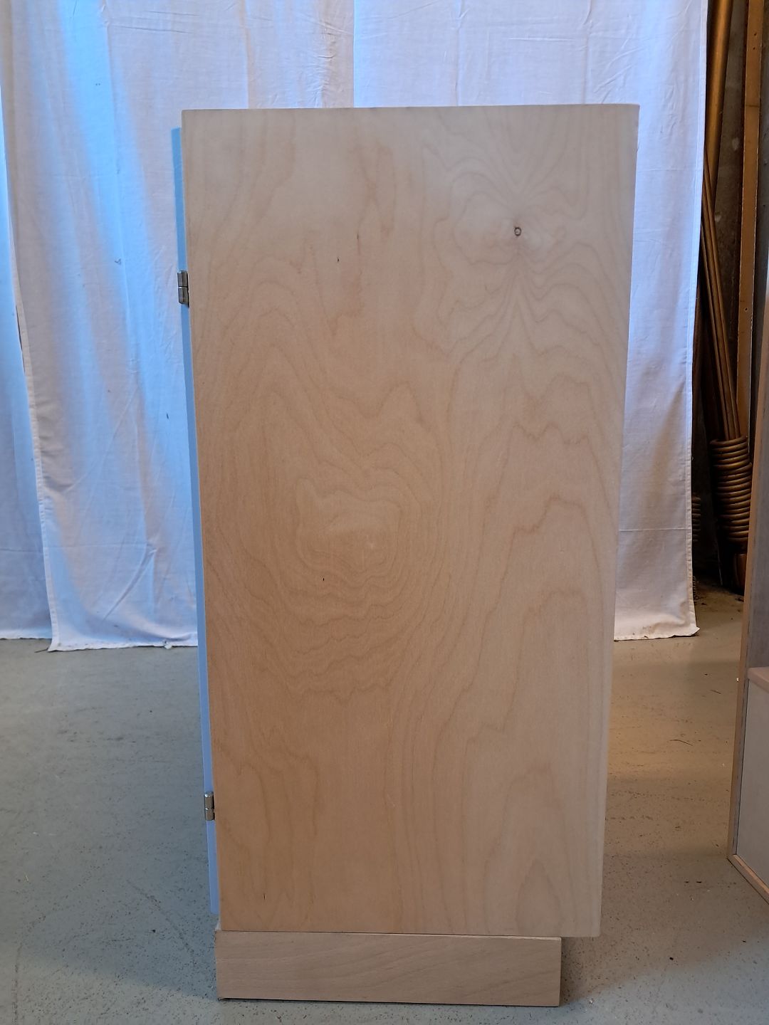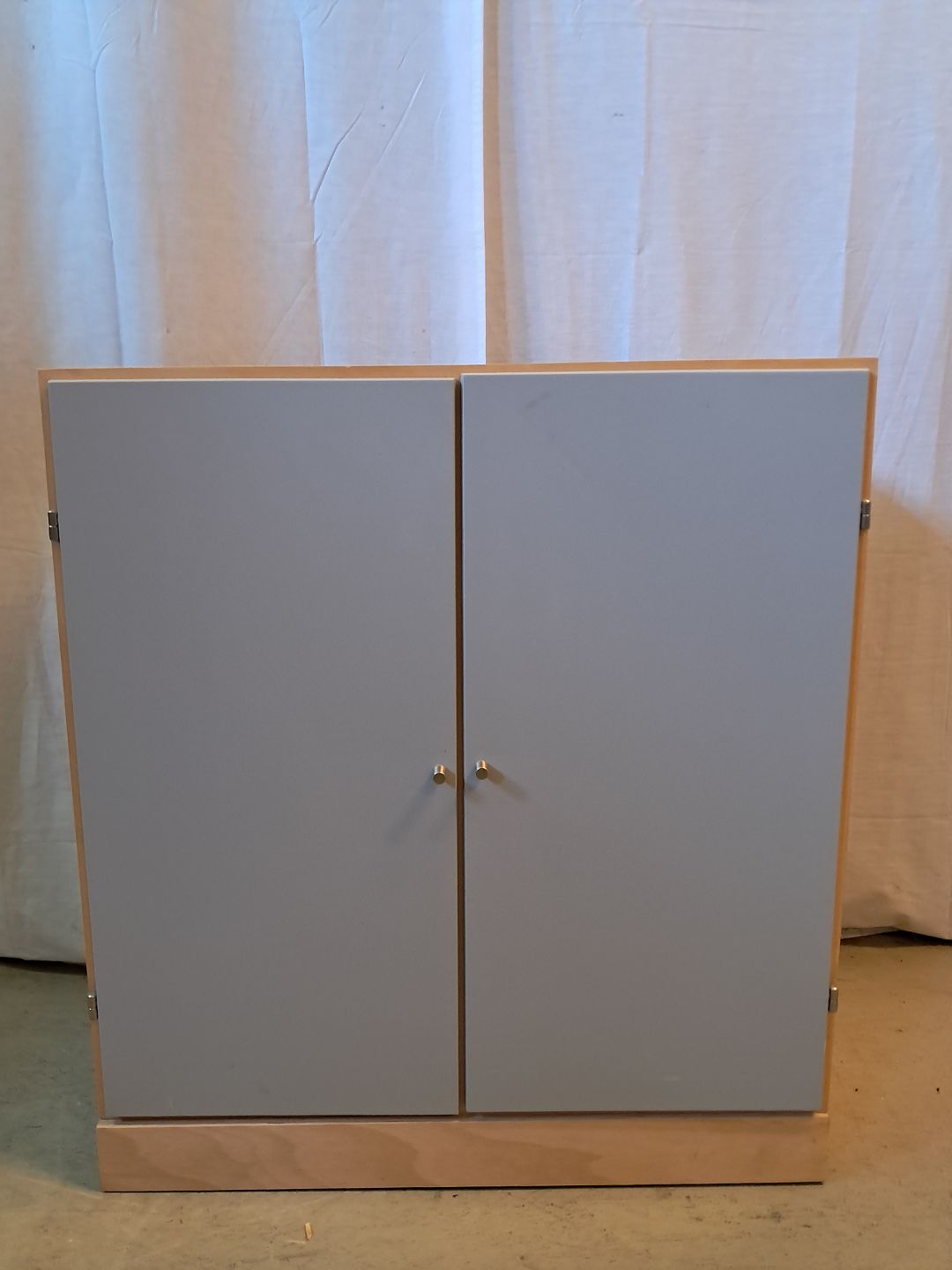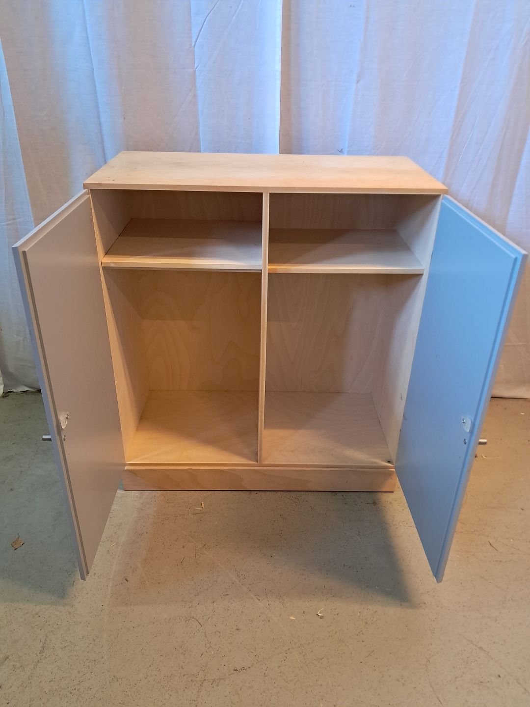 At-bo reolkasse i krydsfiner med malede låger, fra 2000erne.