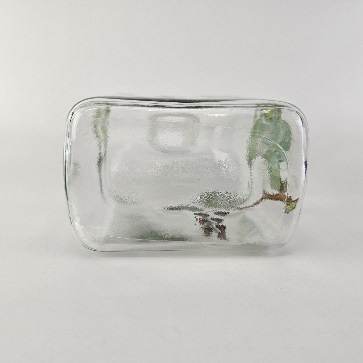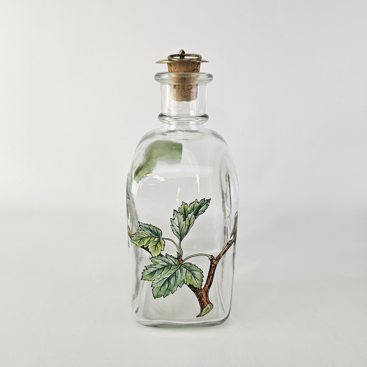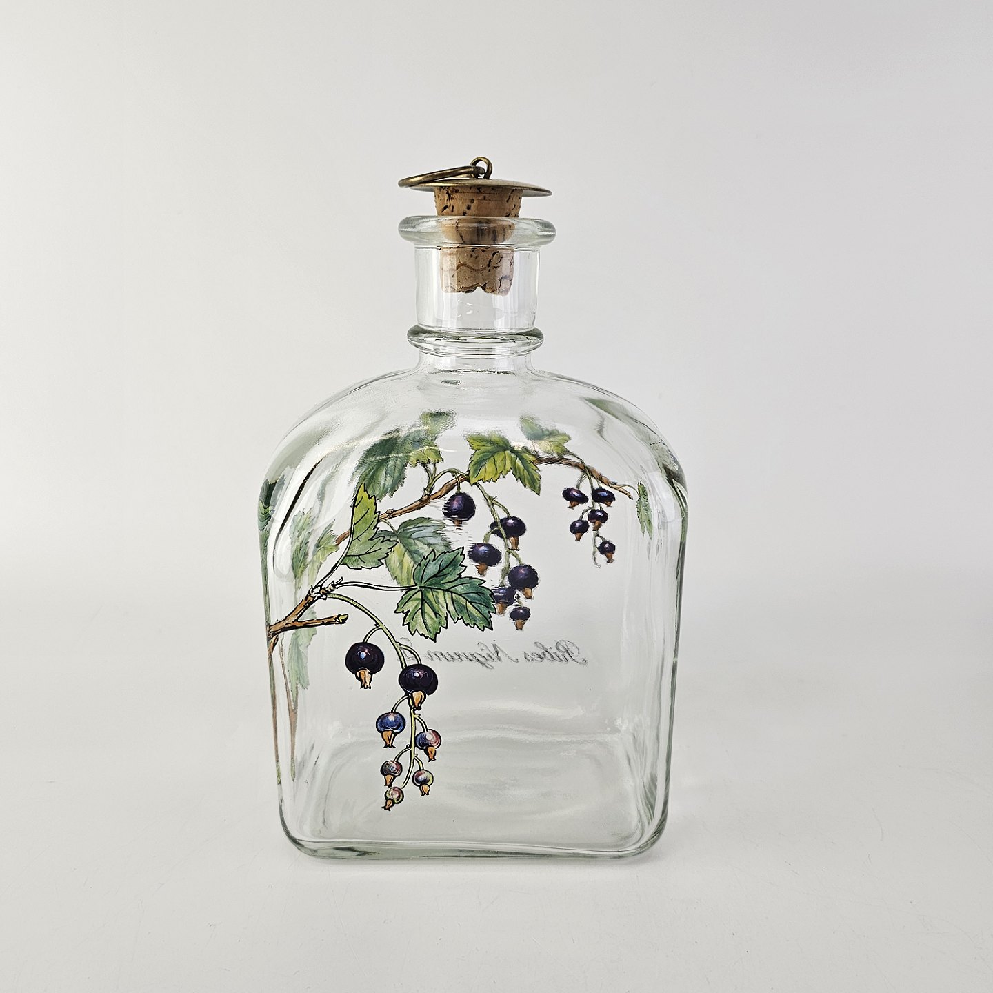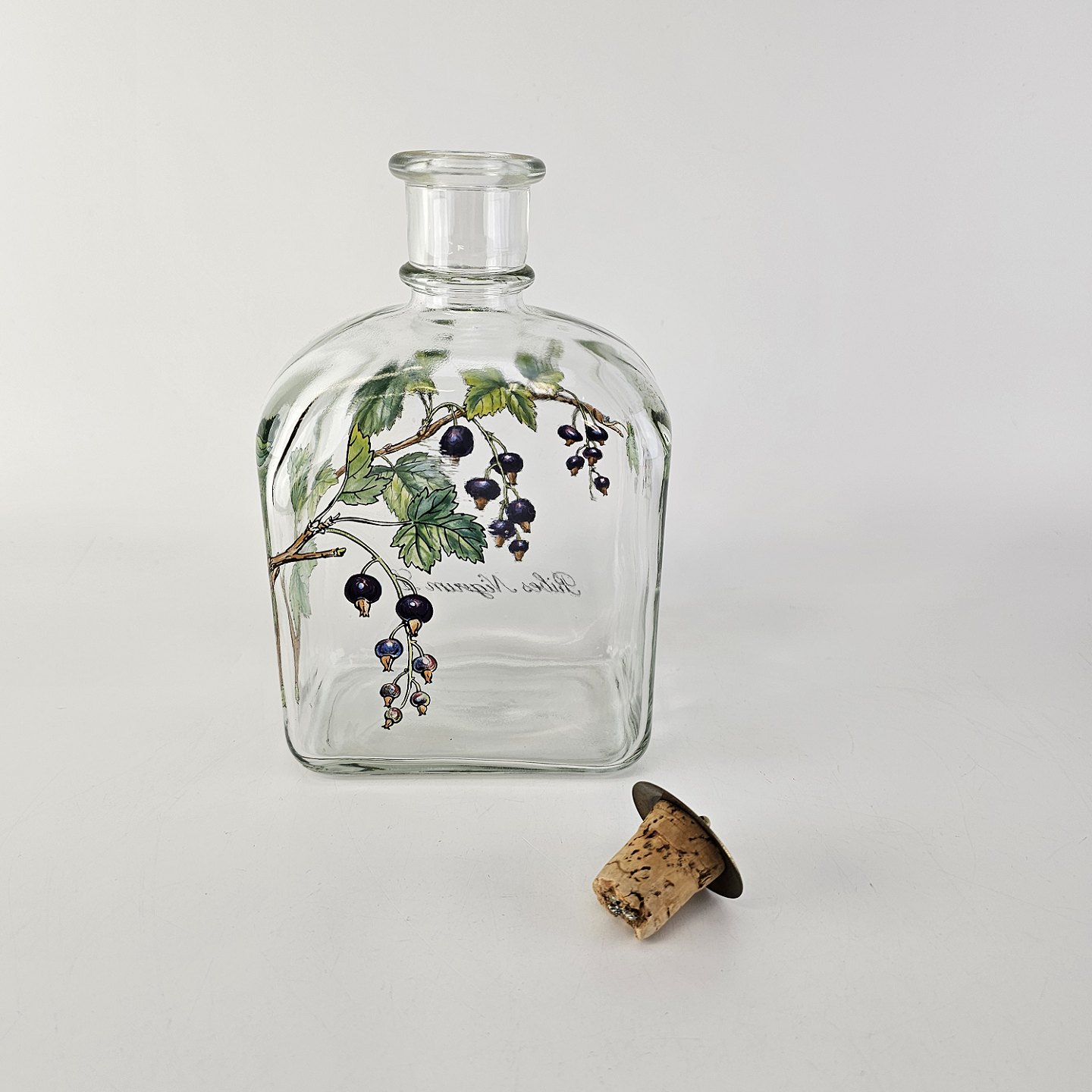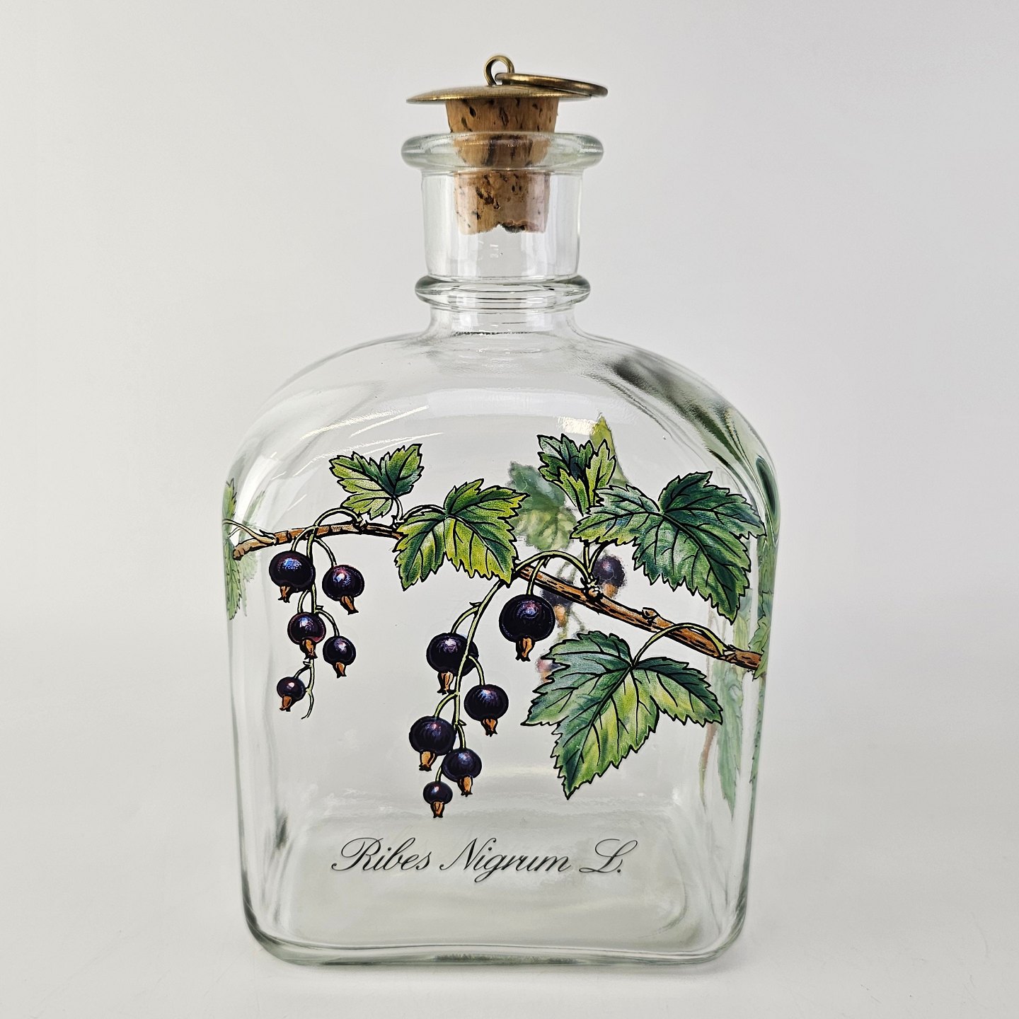Text available in Danish: Karaffel i klart glas med korkprop fra serien Brændevins Amatøren, dekoreret med en gren af solbær og teksten Ribes Nigrum L.