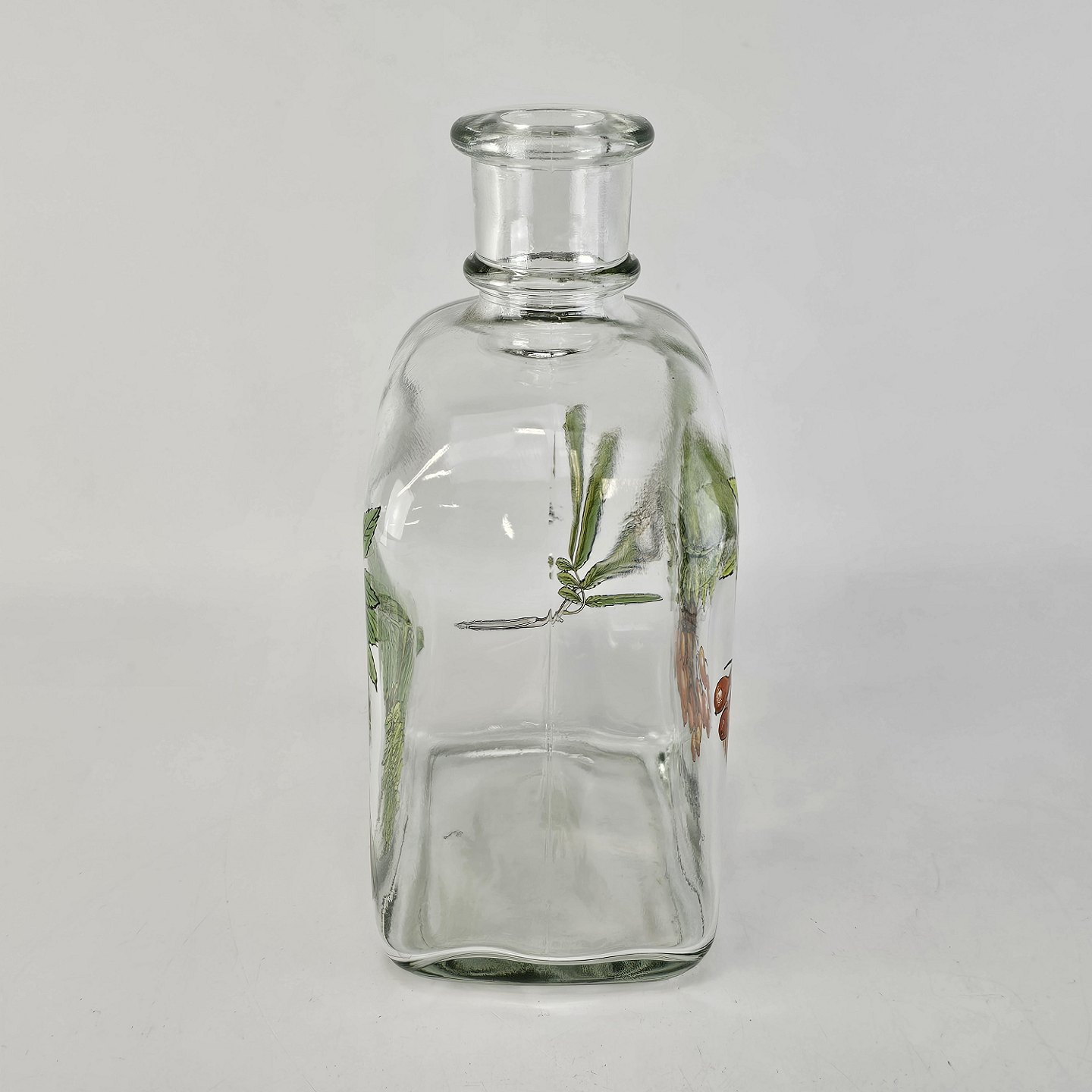 Text available in Danish: Karaffel i klart glas med korkprop fra serien Brændevins Amatøren, dekoreret med en gren af rønnebær og teksten Sorbus Aucuparia L.