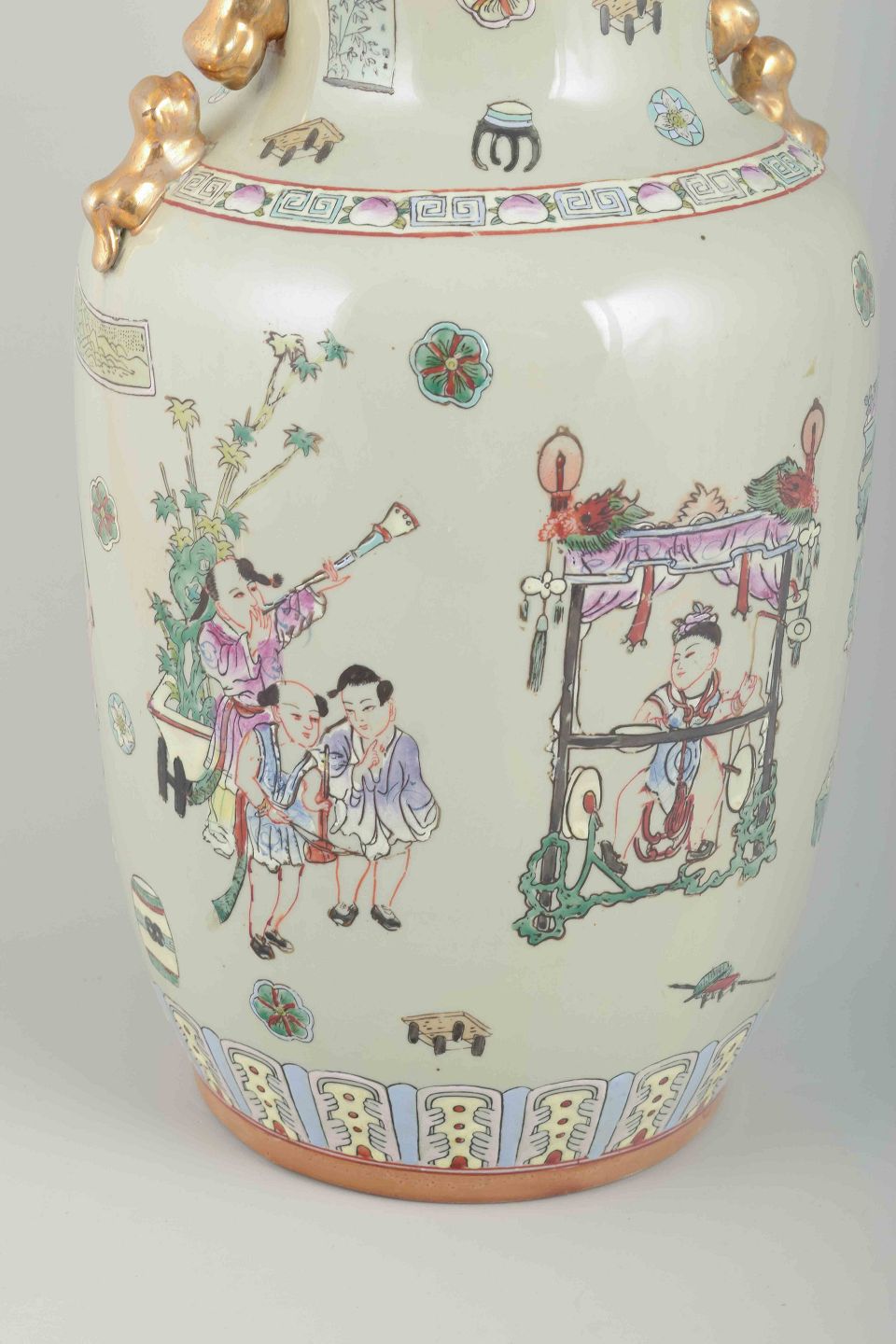Chinese porcelain vases of the 20th century combine traditional decorative forms with modern production techniques. Painted scenes depicting figures from classical Chinese culture are characteristic, while gilt lion handles highlight their link to earlier imperial prototypes.