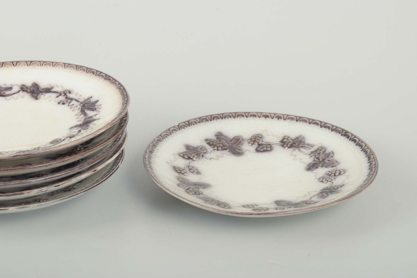 Set of 12 round faience plates with relief decoration and grapevine motif in a brownish tone along the rim.