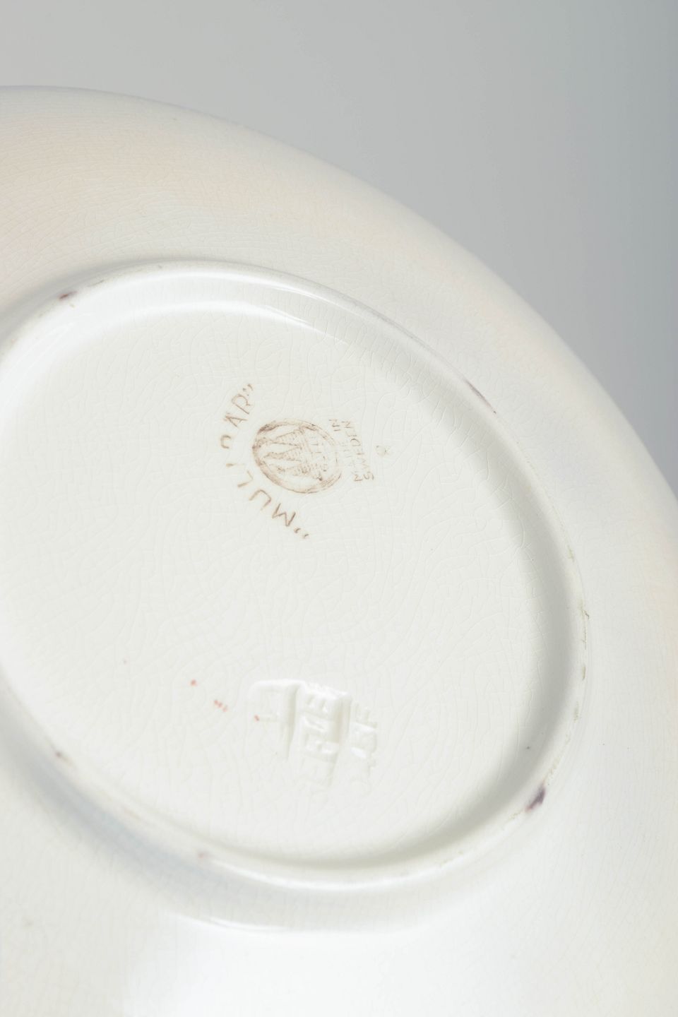 Bio: Gefle Porcelain Factory was founded in 1910 in Gävle and became one of Sweden’s most important porcelain and faience producers. In the 1930s, the factory continued the tradition of making transfer-printed and relief-decorated tableware for both household use and export. The “Mullbär” pattern is a fine example of the period’s naturalistic ornamentation, featuring grapevine motifs inspired by classical and historical styles.