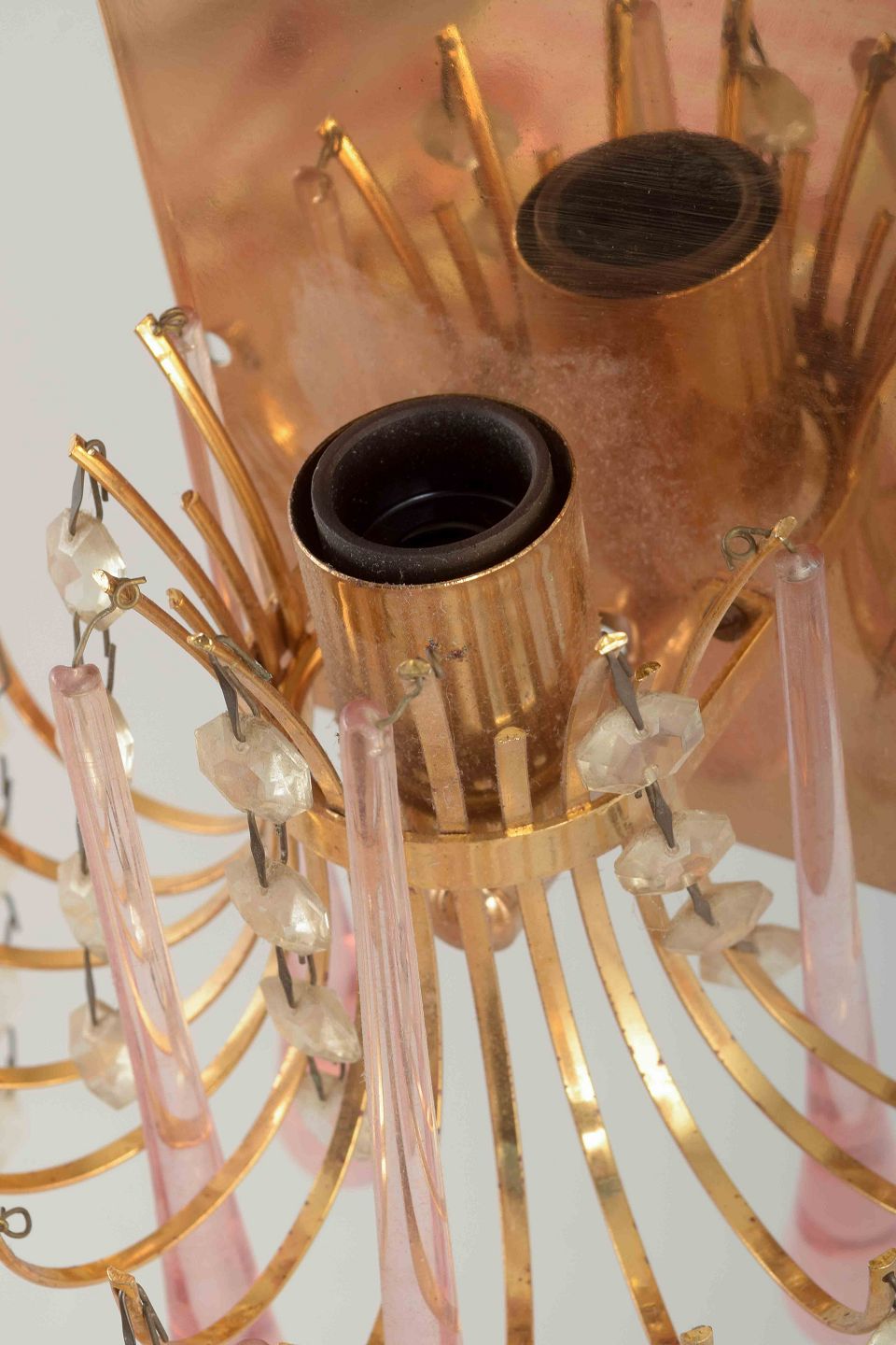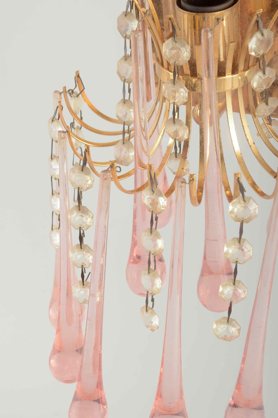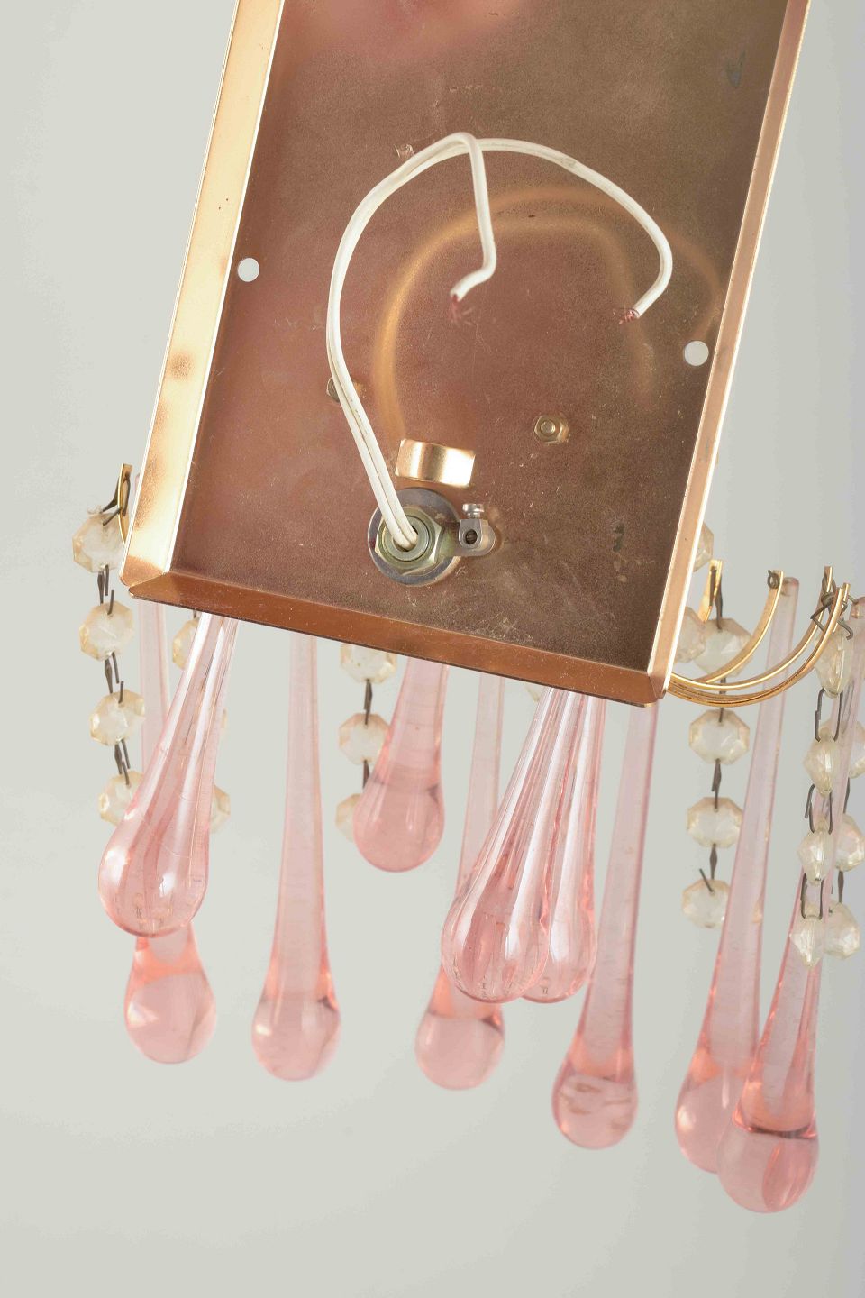 A pair of elegant wall lamps in brass with suspended teardrop-shaped prisms in pink Murano glass and clear glass bead chains.