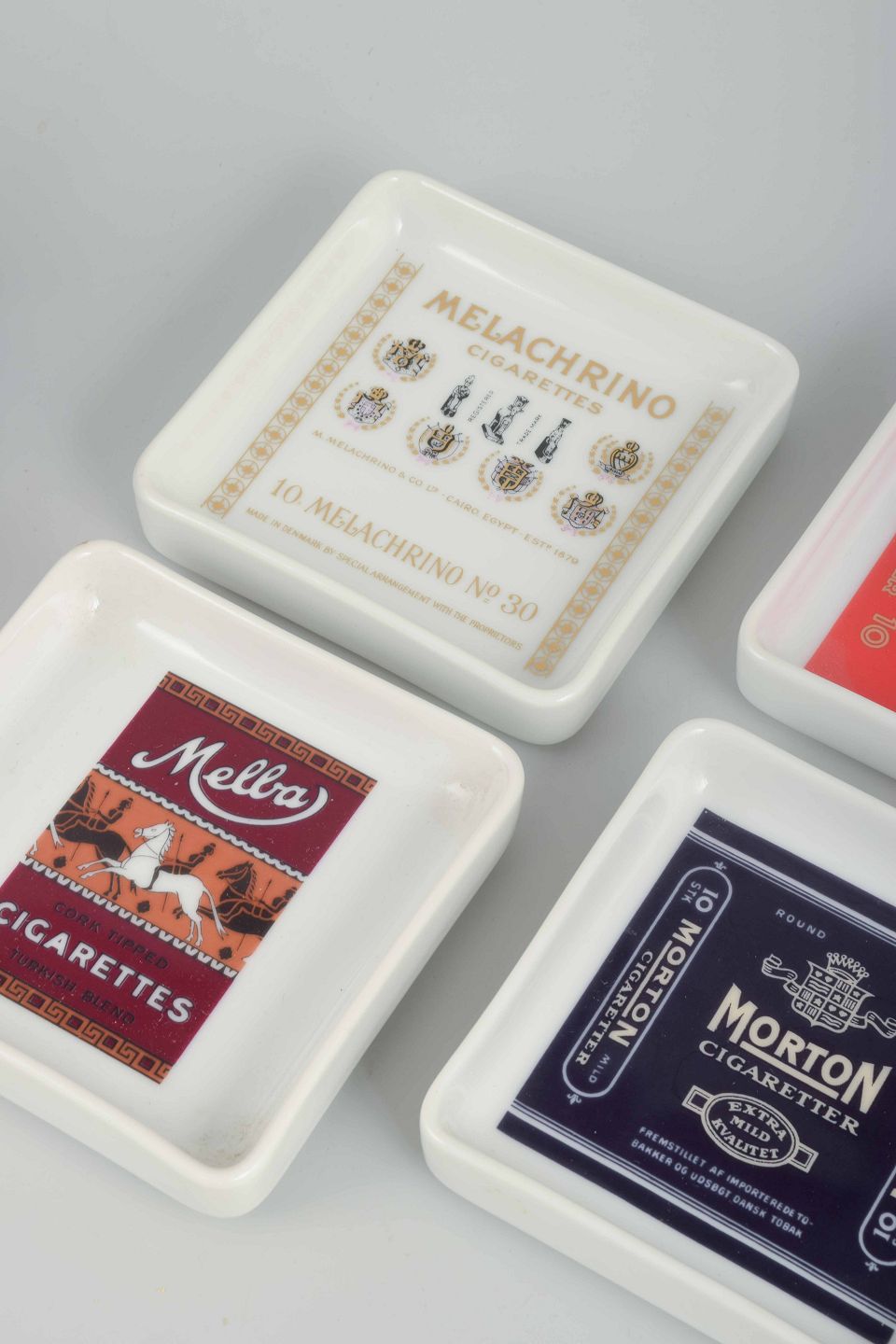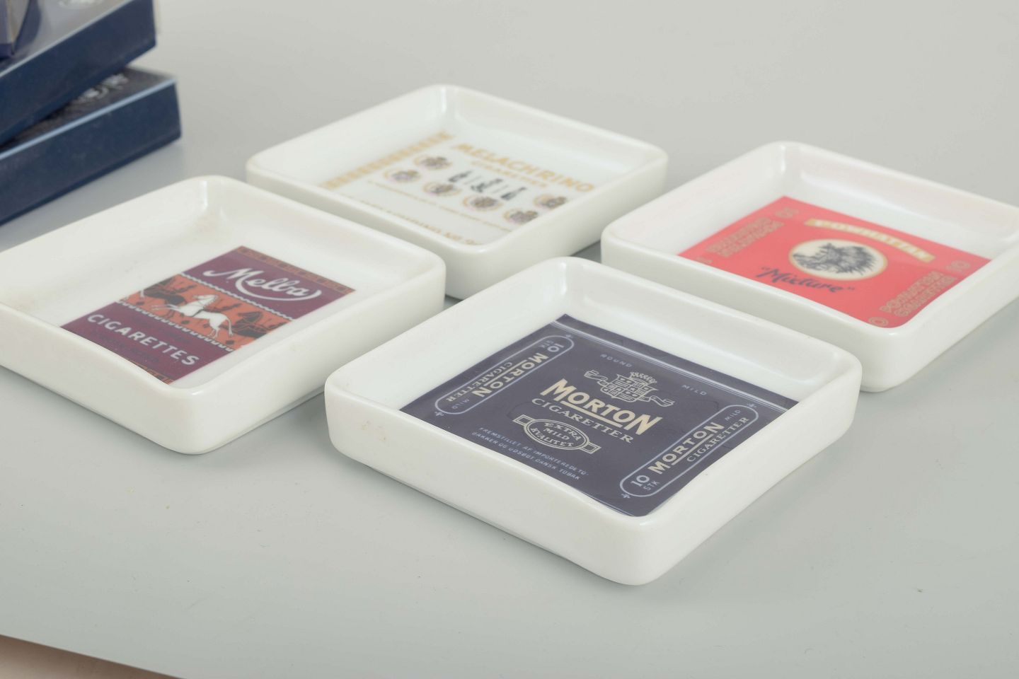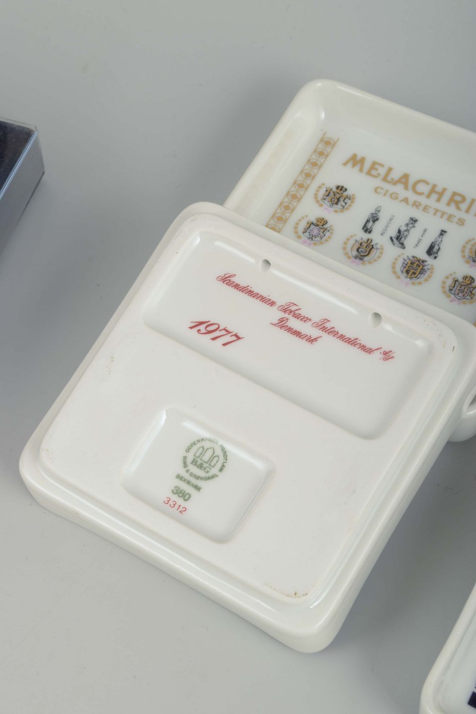 Founded in Copenhagen in 1853, Bing & Grøndahl is renowned for fine porcelain and collectible pieces. In the 1980s the factory also produced smaller series of decorative utility items, including ashtrays with advertising and tobacco motifs. These four examples reflect both the quality of Danish porcelain craftsmanship and the graphic design of the period. After the 1987 merger with the Royal Porcelain Factory (Royal Copenhagen), Bing & Grøndahl became part of Royal Copenhagen, making such objects especially interesting collector’s items today.