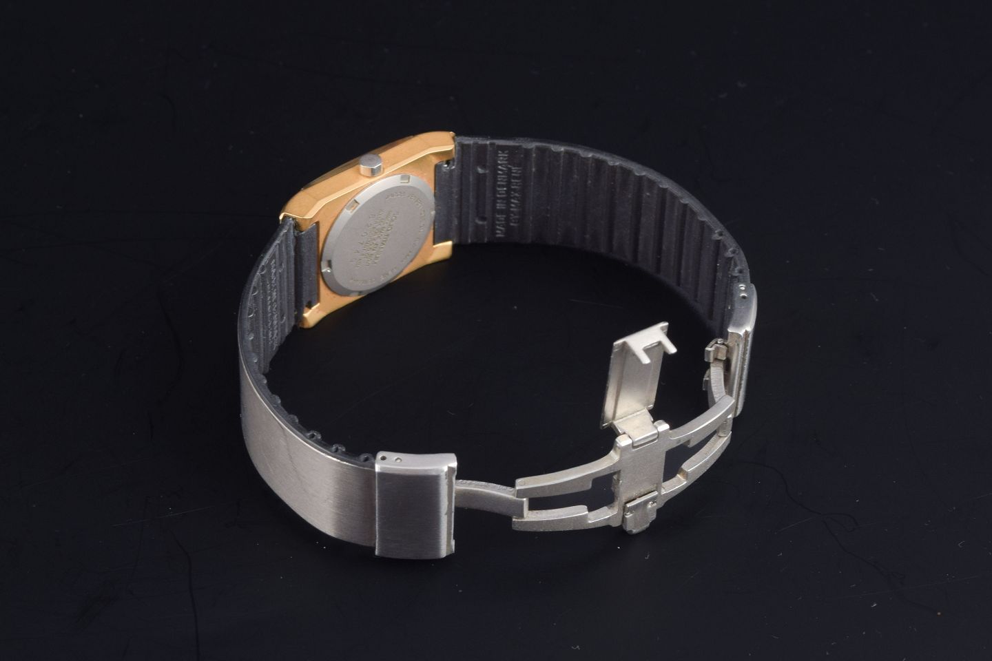 Rectangular wristwatch with a two-tone case in gilt and brushed titanium, minimalist dial in grey and gold, and original integrated bracelet.