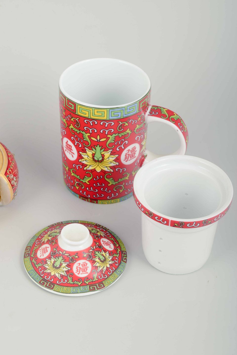 Cylindrical mug with handle and lid, decorated in red and multicoloured famille rose style with floral and band ornamentation as well as Chinese characters. Together with six round bottle-/glass-coasters in a matching holder.
