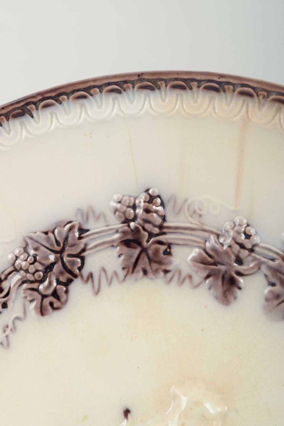 Round faience plate with relief decoration and transfer-printed vine motif in brown tone, centrally decorated with putti figures (cherubs/angels).