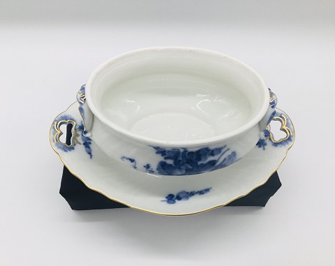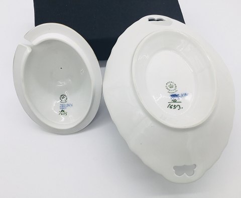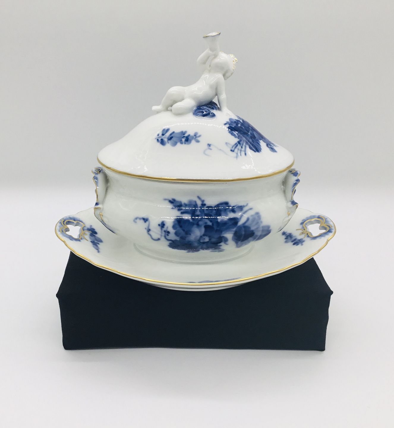Text available in Danish: Royal Copenhagen, Blå Blomst svejfet med guld, sjælden sovsekande på