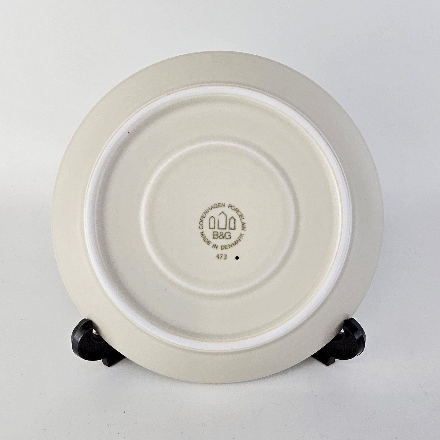 Kop og underkop i stentøj fra stellet Edith Sonne, mat hvid dekoreret med en blå stribe