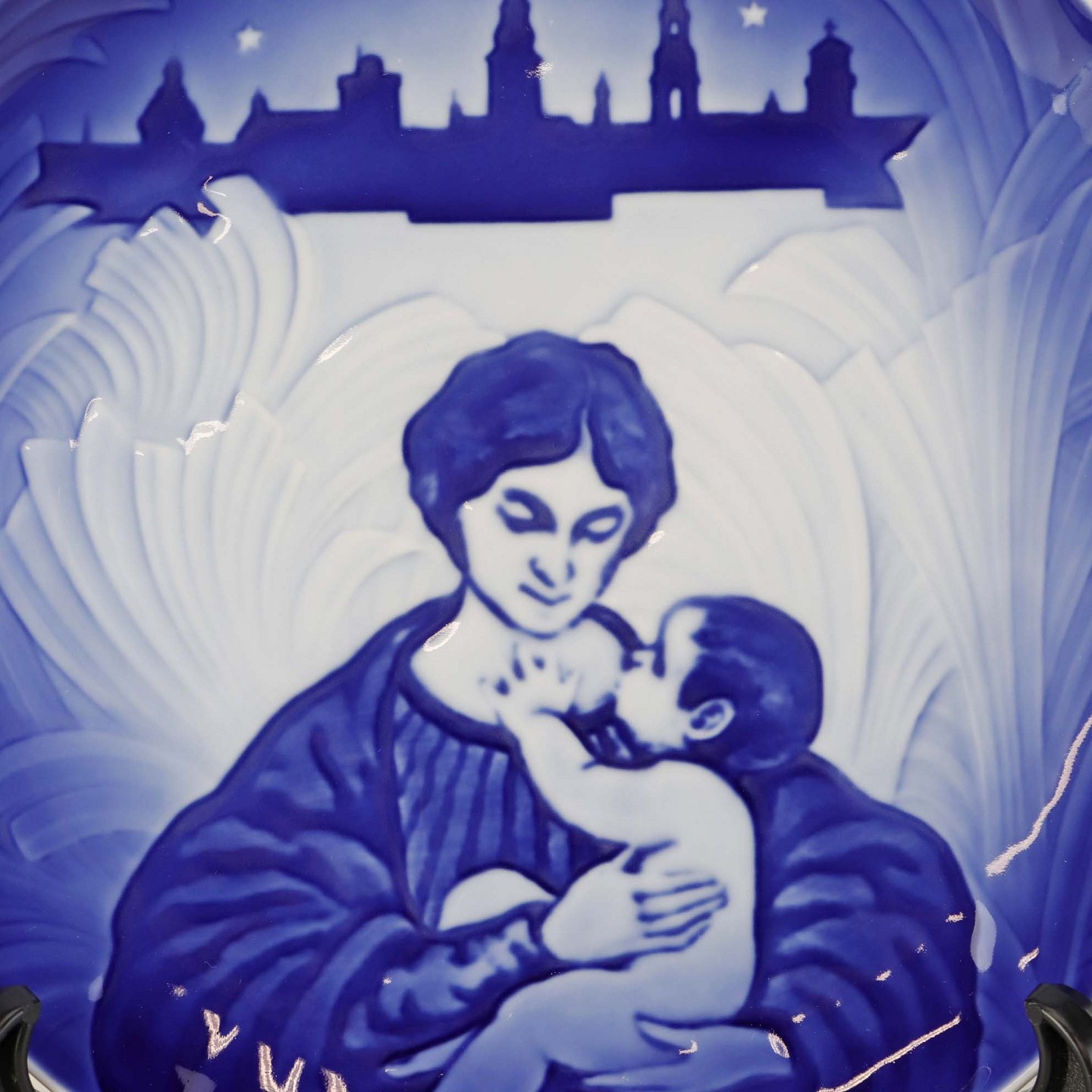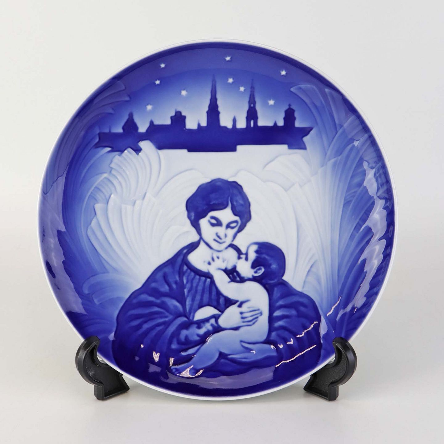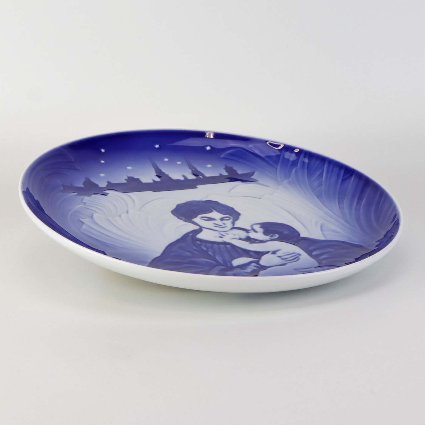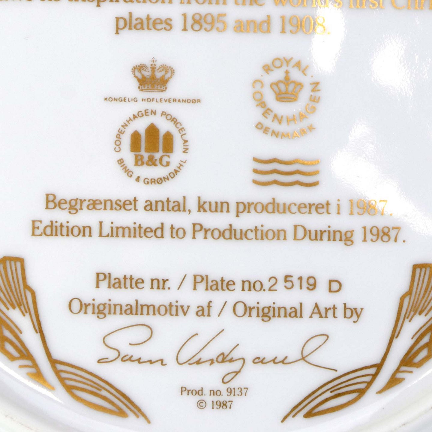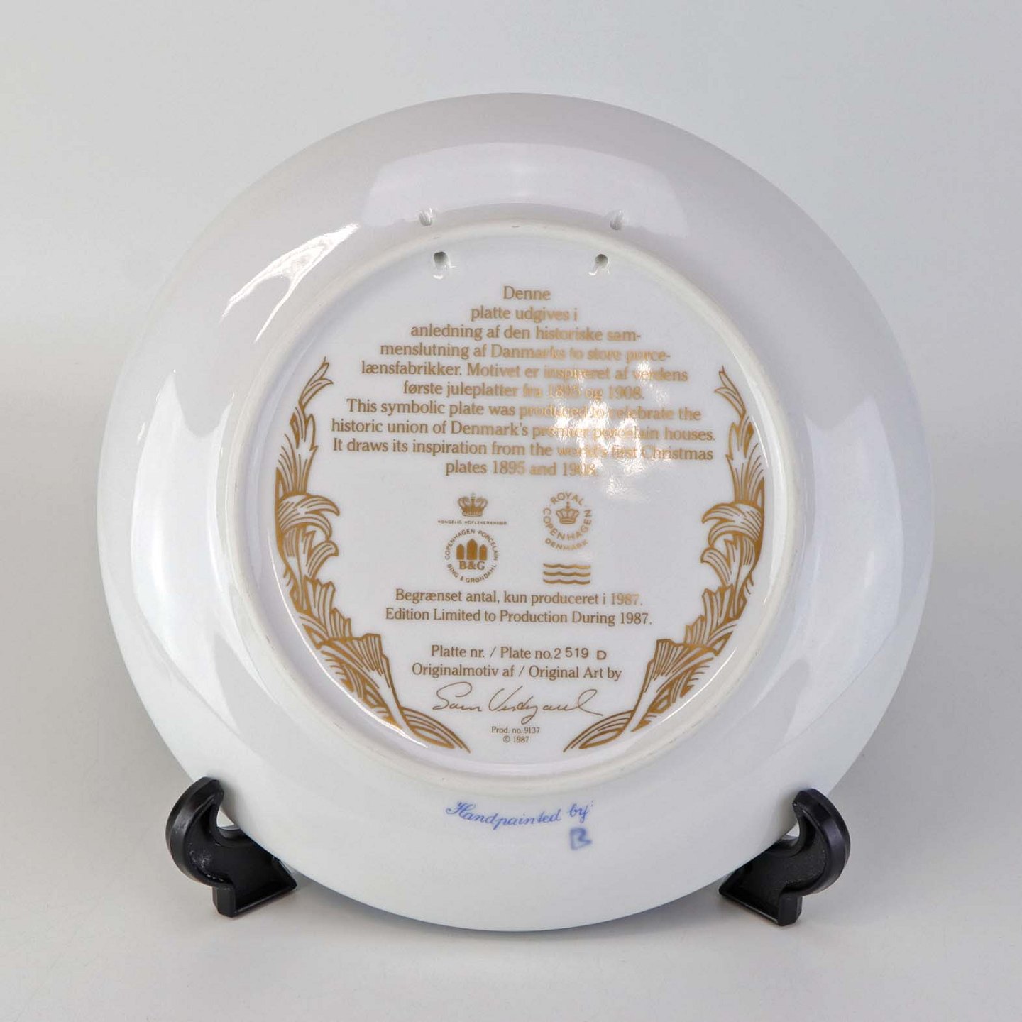 Text available in Danish: Håndmalet mindeplatte i porcelæn fra år 1987 i anledningen af sammenslutningen af Danmarks to store porcelænsfabrikker Bing & Grøndahl og Royal Copenhagen. Motivet er inspireret af juleplatten fra år 1895 og år 1908.