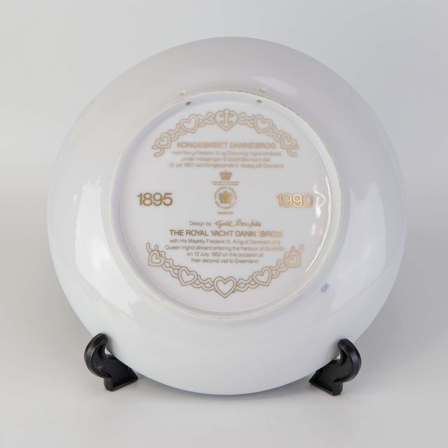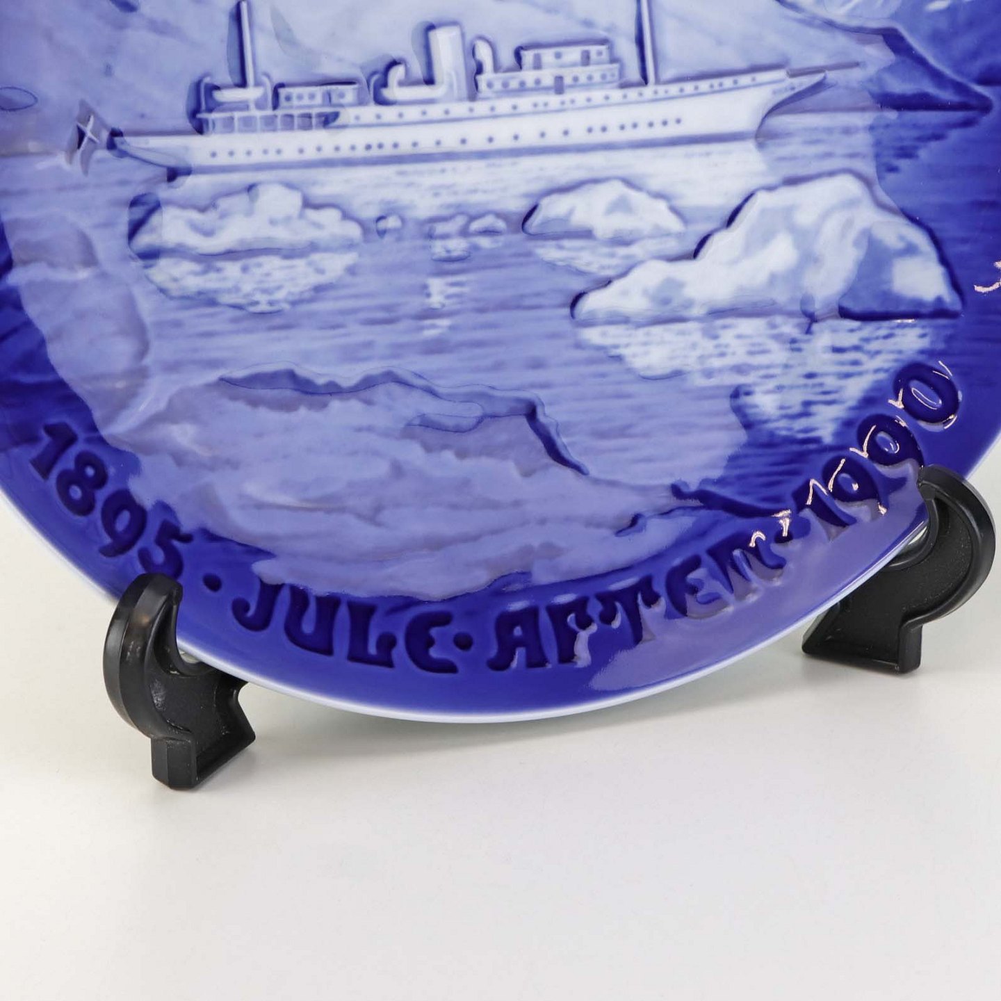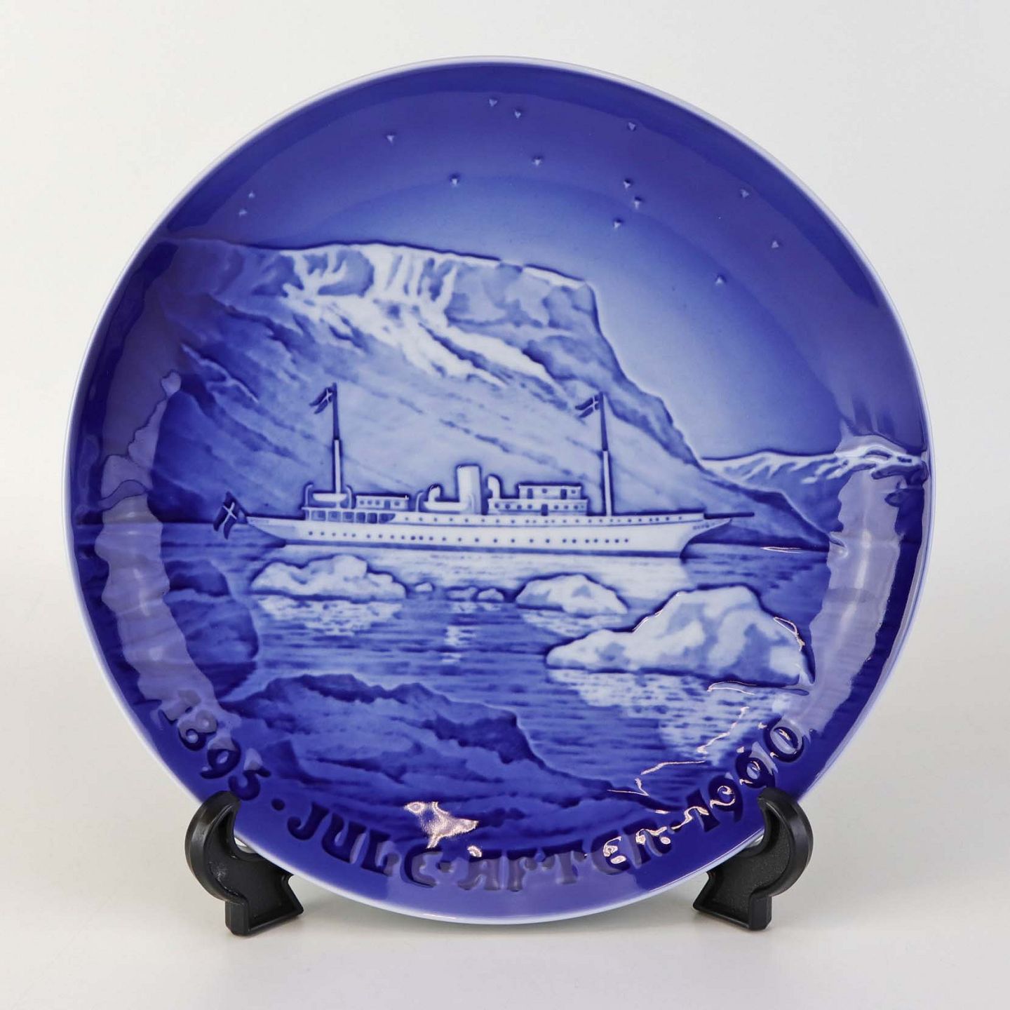 Text available in Danish: Jubilæumsplatte i porcelæn. Fremstillet i forbindelse med 95 års jubilæet for den første juleplatte fra år 1895. Plattens motiv viser Kongeskibet Dannebrog ved indsejlingen til Godthåbs havn ved Grønland. Teksten Juleaften 1895-1990.