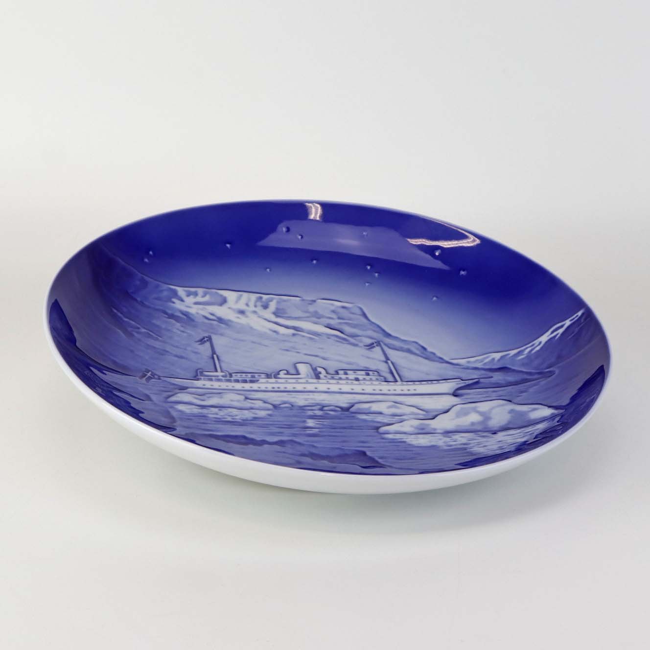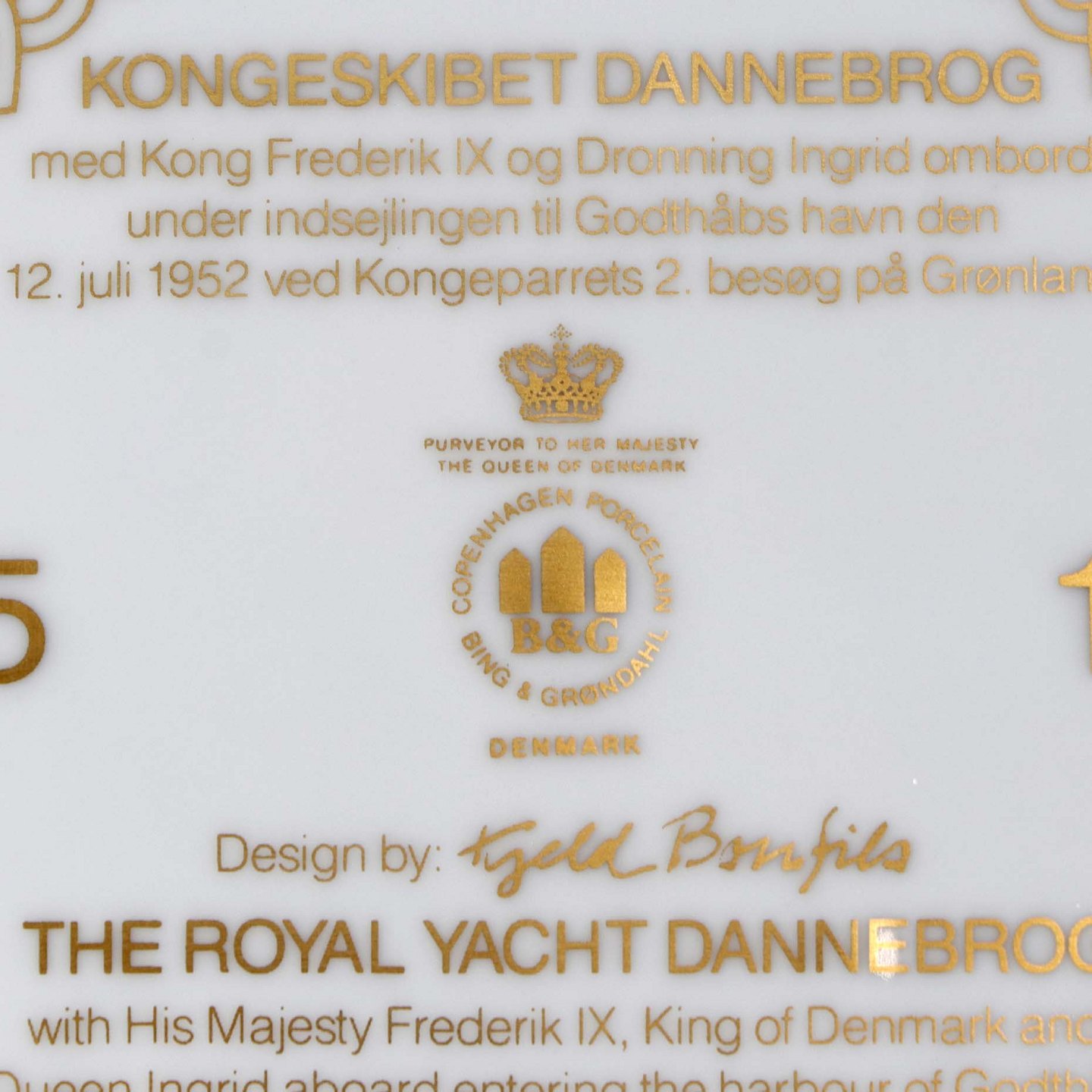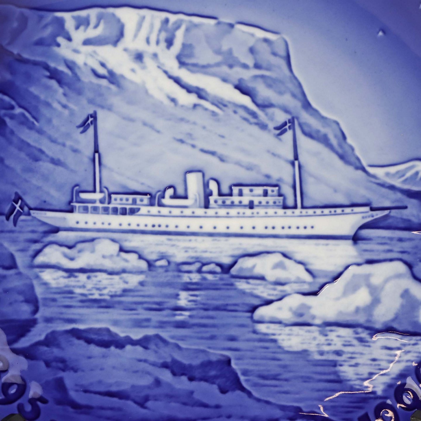 Text available in Danish: Jubilæumsplatte i porcelæn. Fremstillet i forbindelse med 95 års jubilæet for den første juleplatte fra år 1895. Plattens motiv viser Kongeskibet Dannebrog ved indsejlingen til Godthåbs havn ved Grønland. Teksten Juleaften 1895-1990.