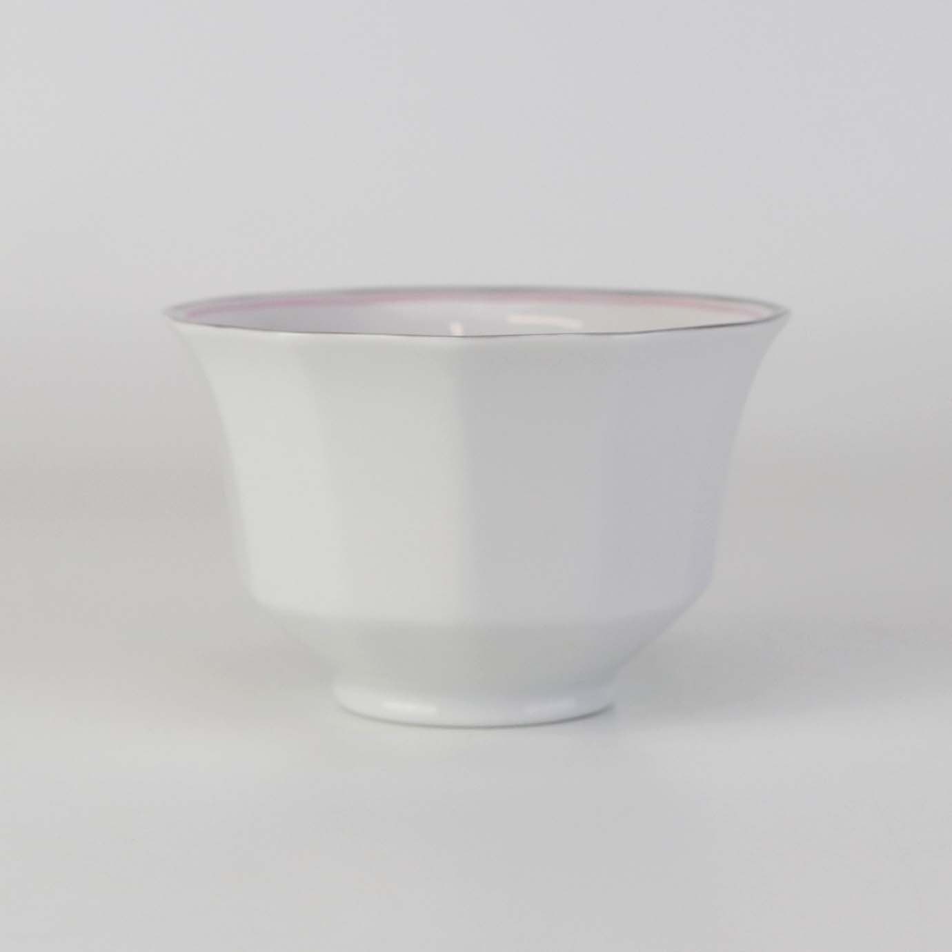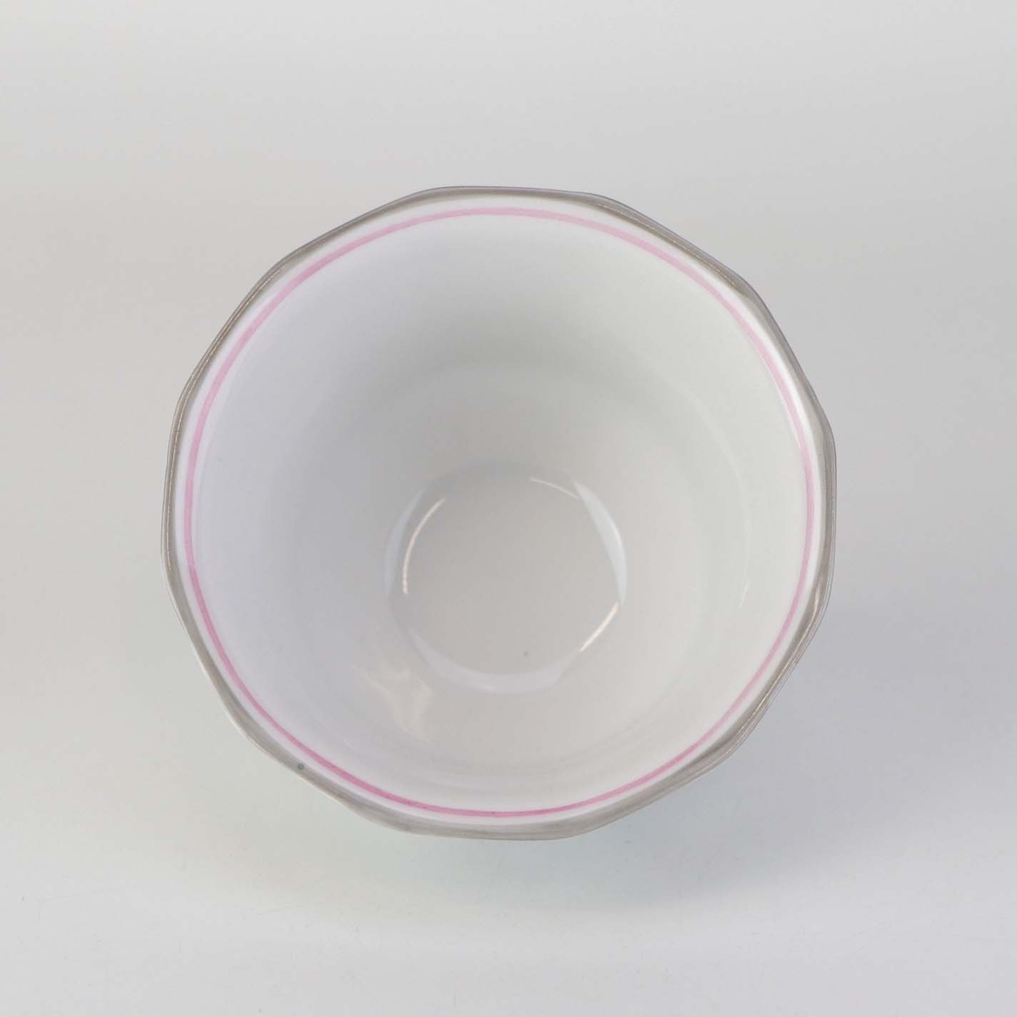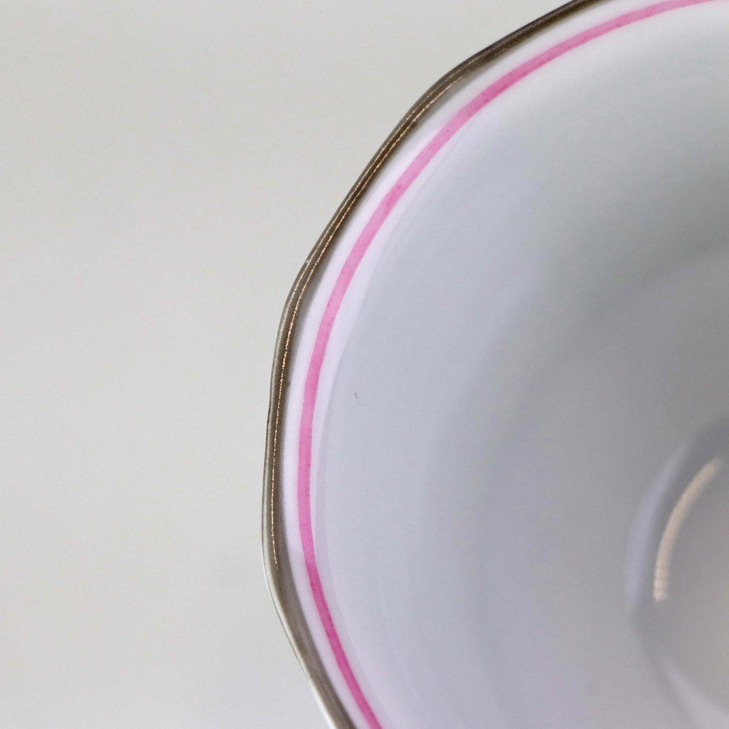 Service i kantet hvidt porcelæn dekoreret med lyserød og grå stribe ved kant.