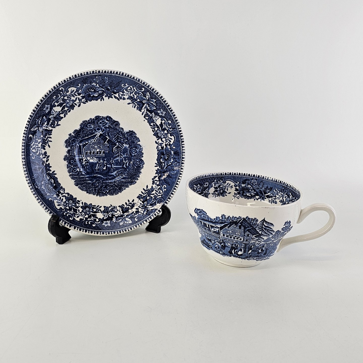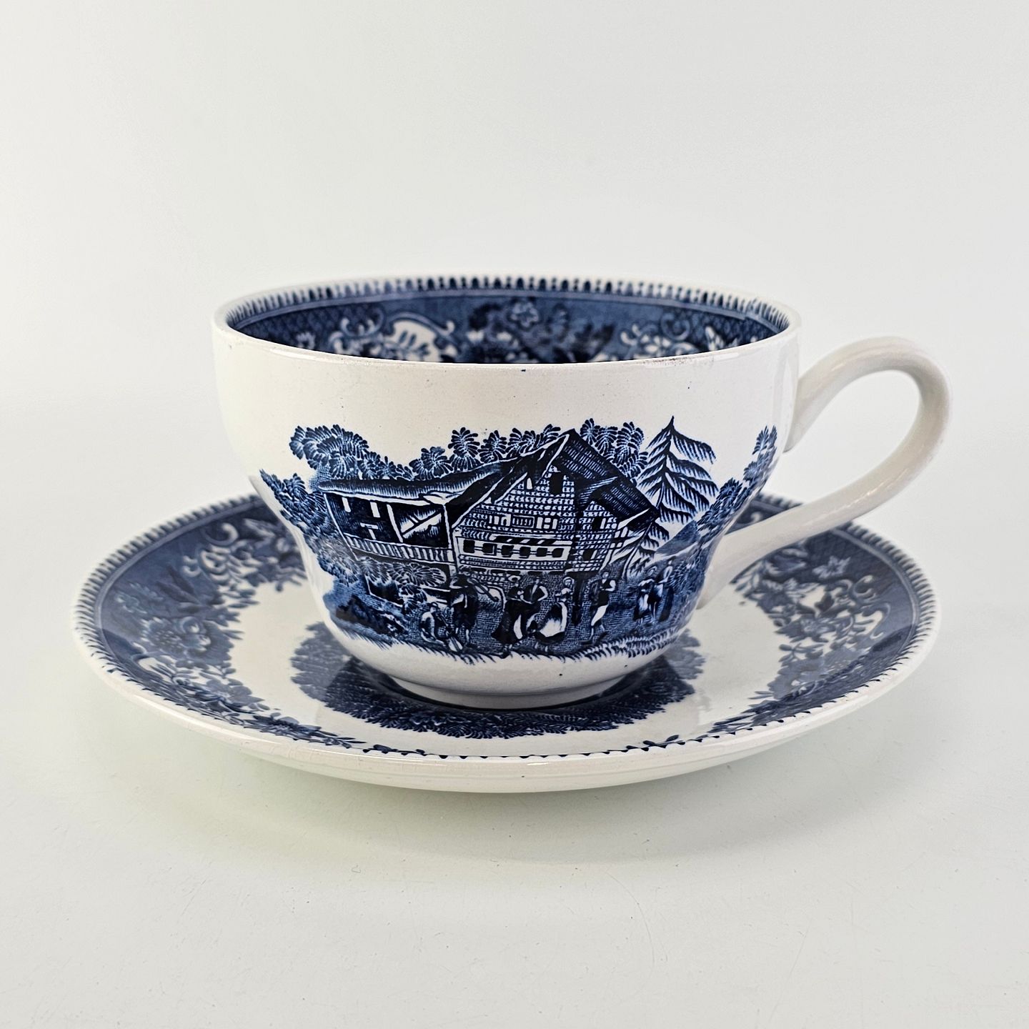Blå kop og underkop i engelsk fajance fra stellet Avon Cottage