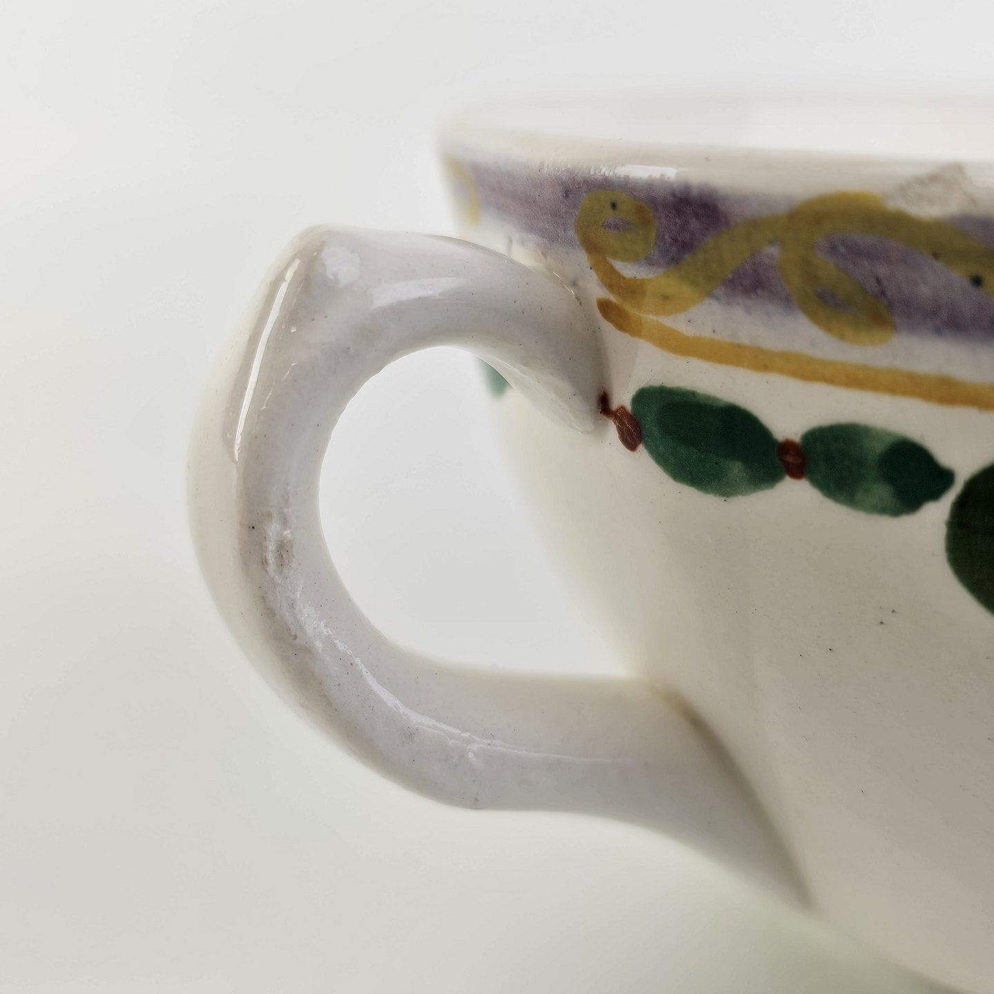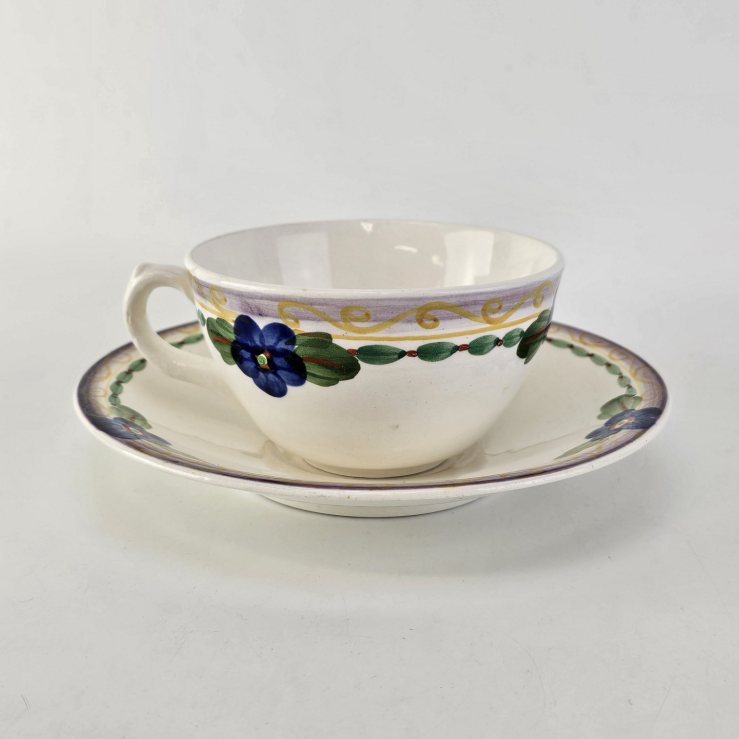 Stellet er i hvid fajance og håndmalet med dekoration af blå violer