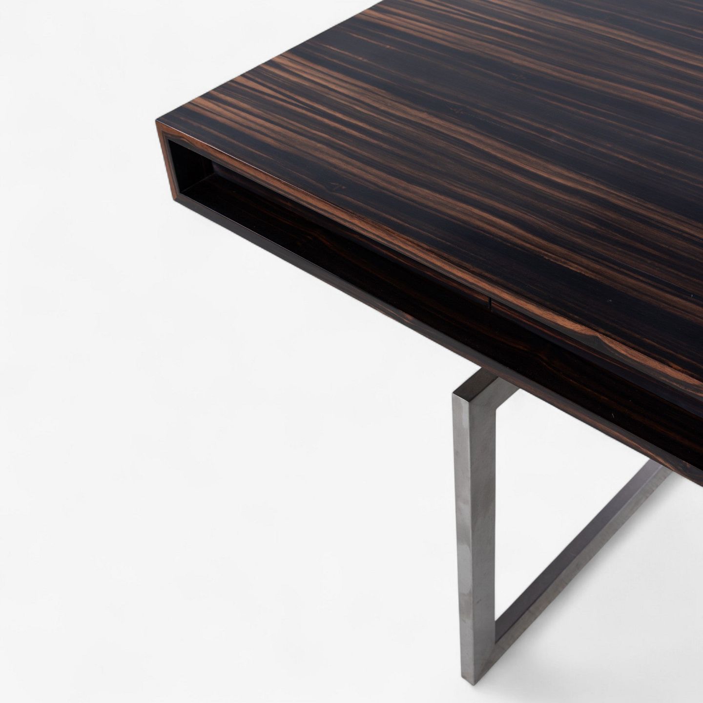 Walnut desk with four drawers, drawer module on wheels and steel frame.