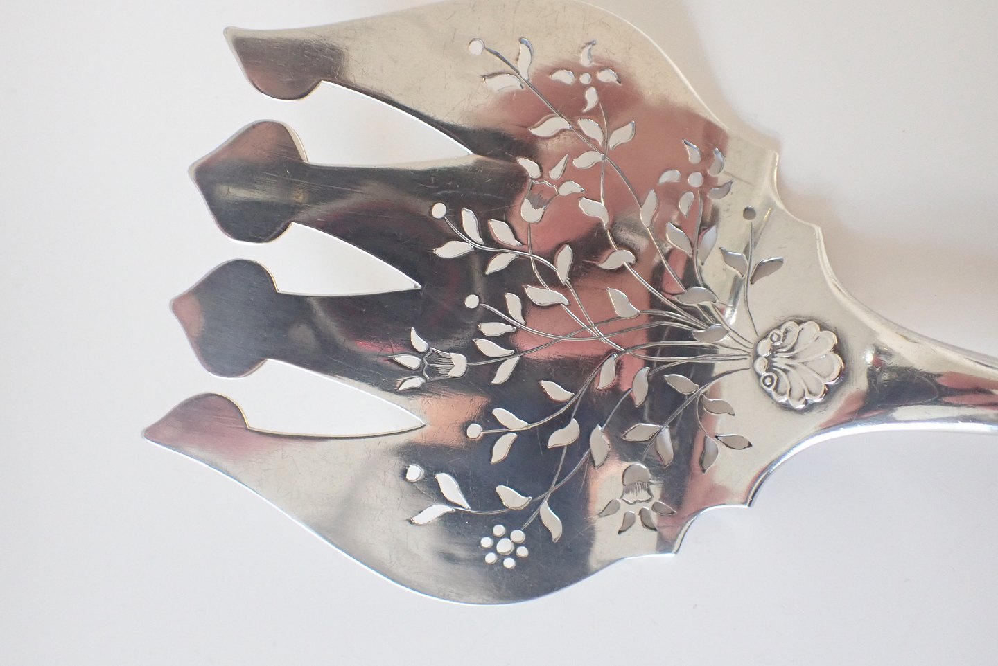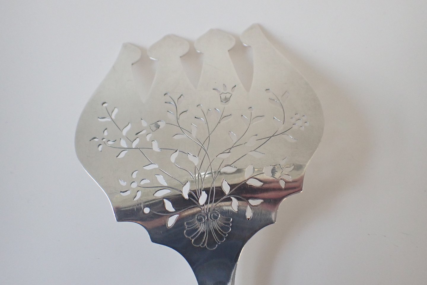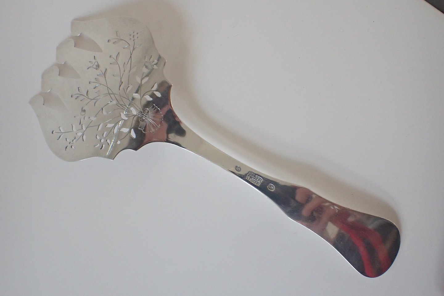 Text available in Danish: Holger Kyster (1898 - 1944) - fiskespade i 825 sølv med perforeret og påsat blomstermotiv. Stemplet Holger Kyster og 2 gange fuglen fra Kolding byvåben. Vægt 106 gram. Længde: 23,2 cm.