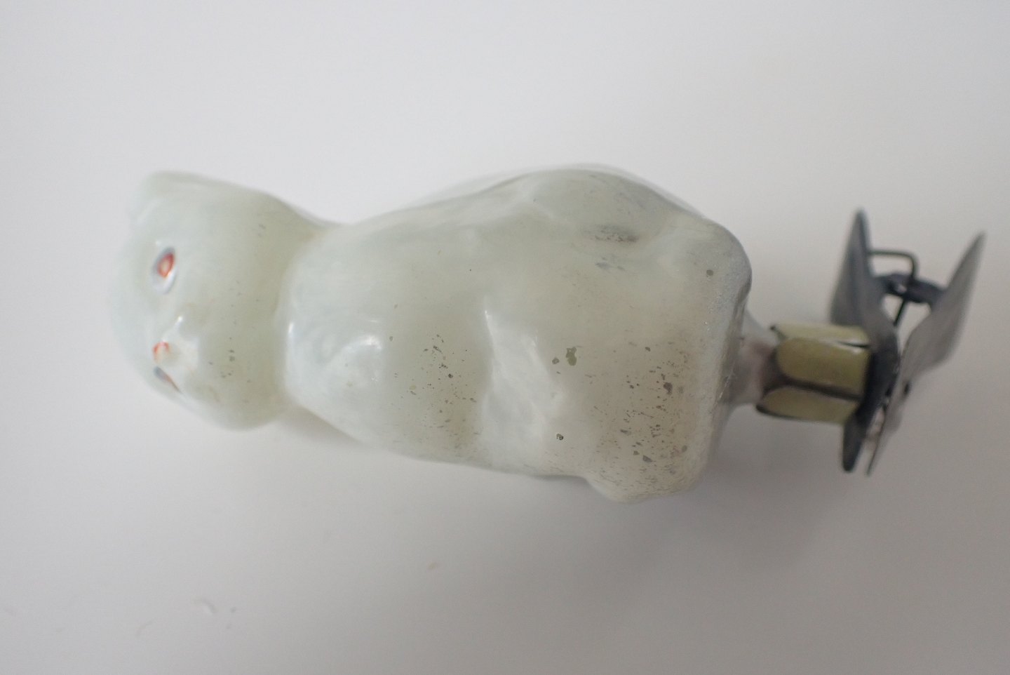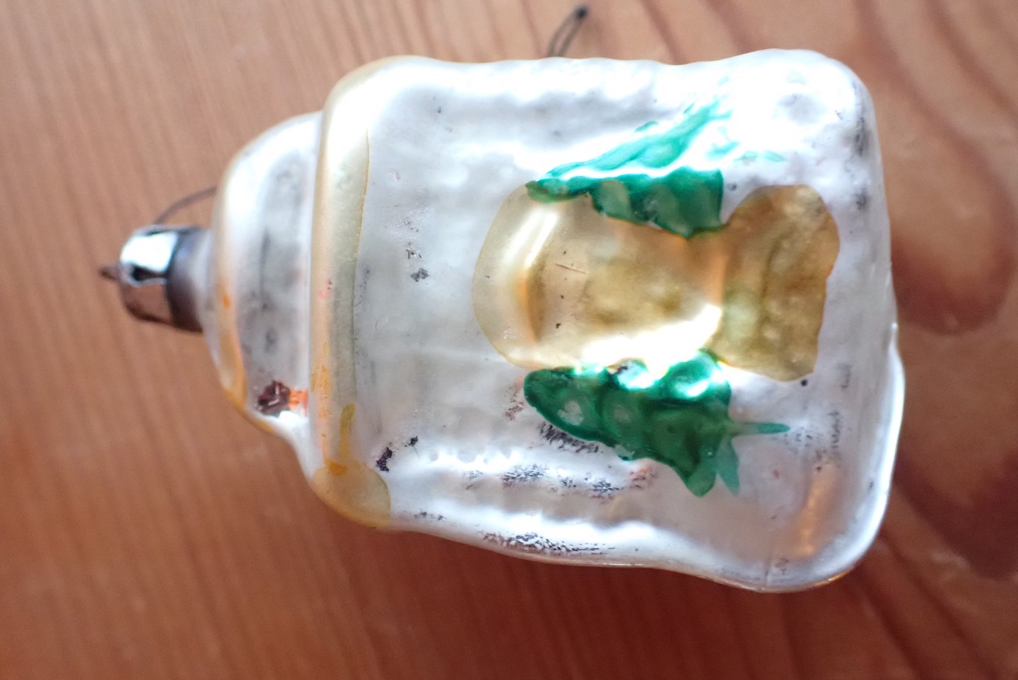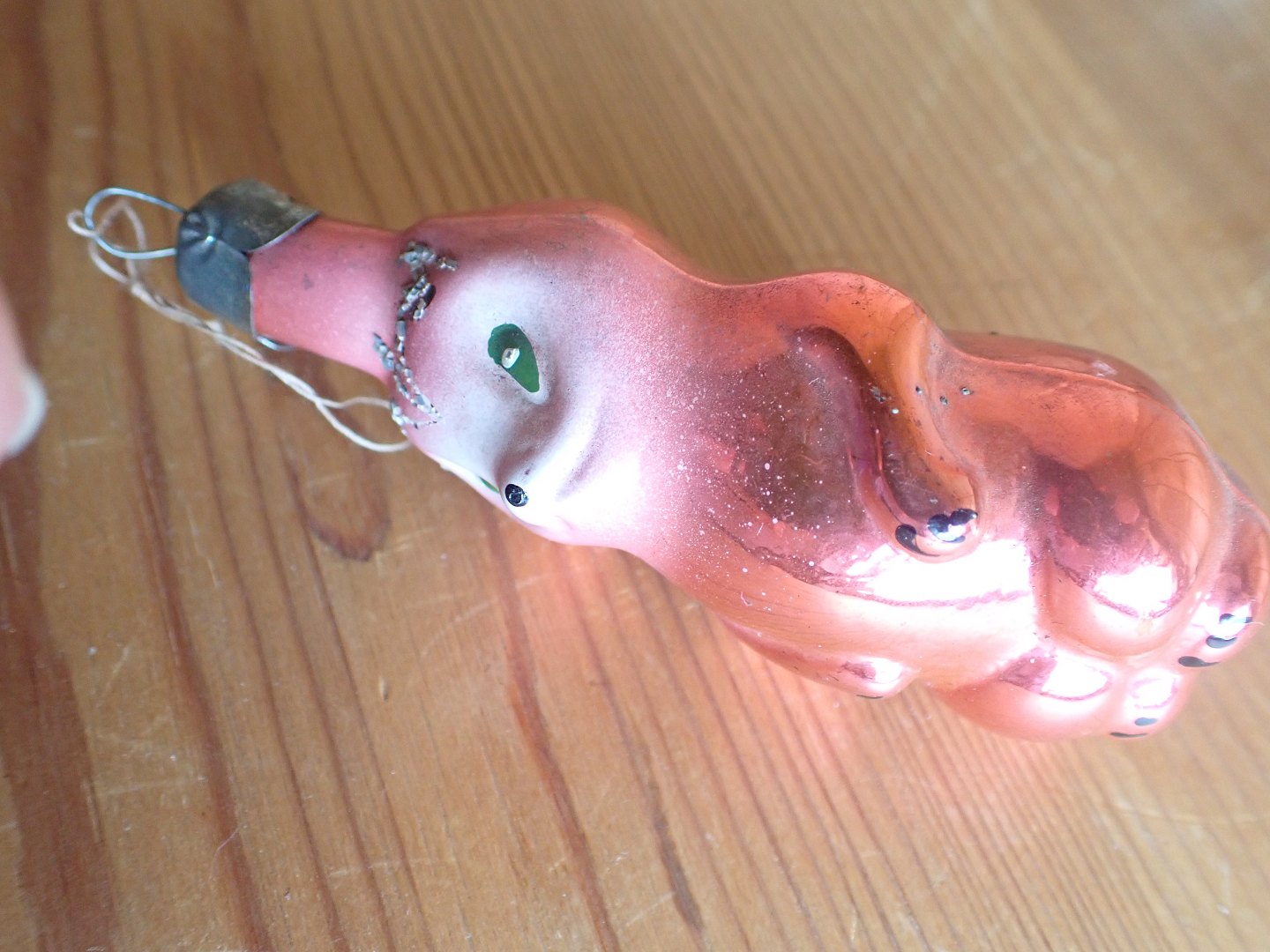 Text available in Danish: 6 glasornamenter, figurer - en russisk agurk, en russisk ræv, et tysk hus, en russisk kat, en russisk snurretop (solgt) og en tysk pengepose. Alle 1930 - 194 og i pæn stand i forhold til alder. Priser: fra 150 - 225 kr.