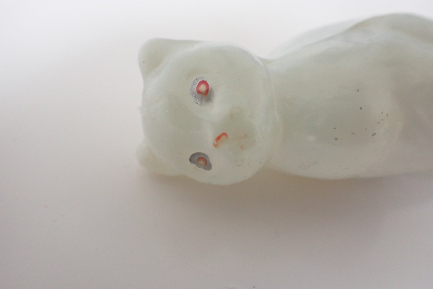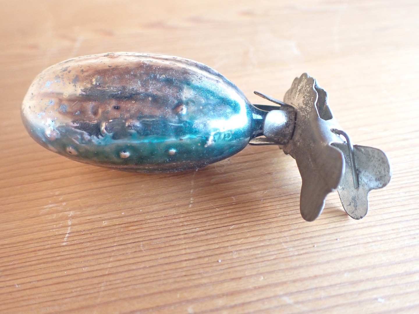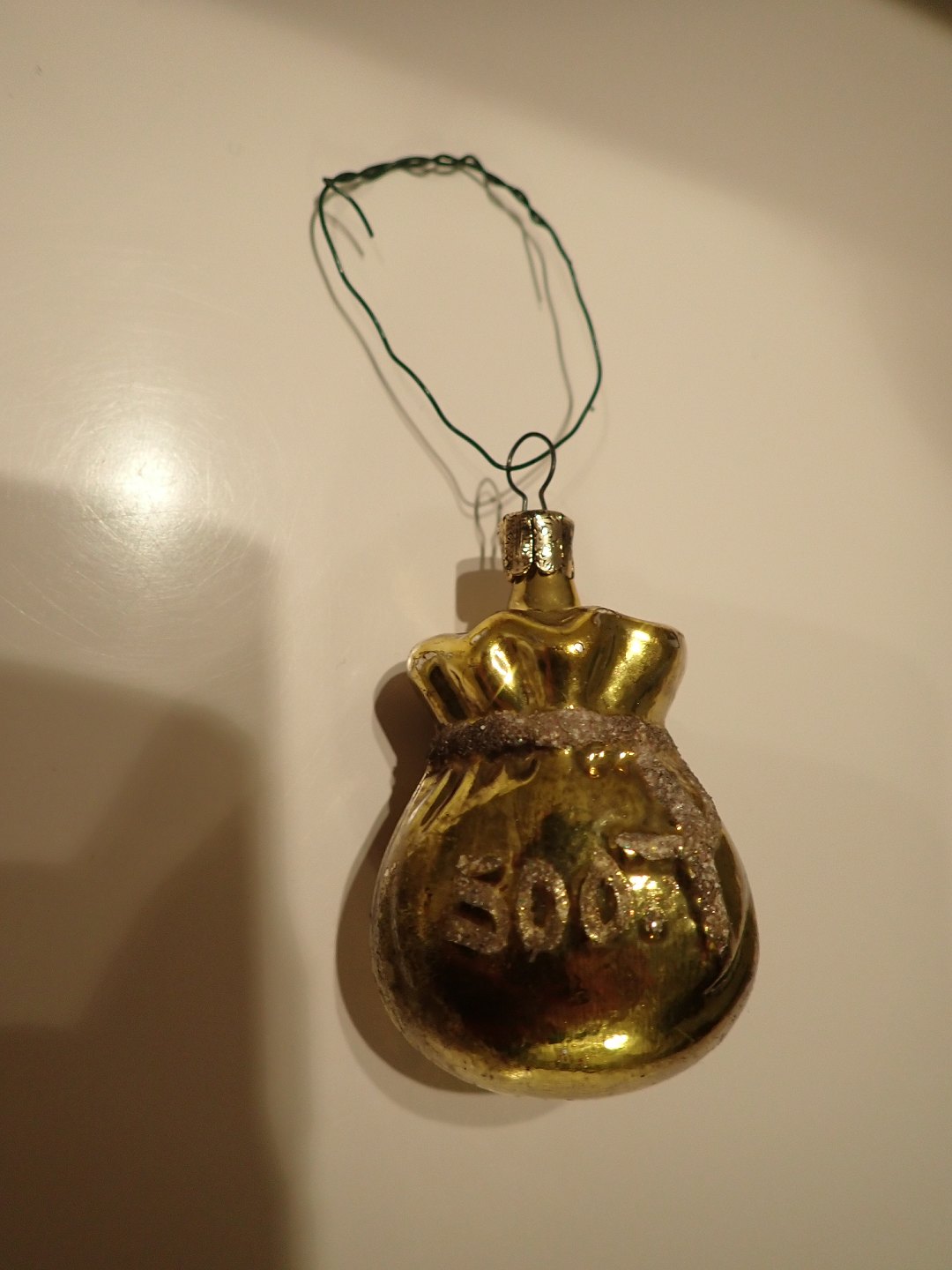 Text available in Danish: 6 glasornamenter, figurer - en russisk agurk, en russisk ræv, et tysk hus, en russisk kat, en russisk snurretop (solgt) og en tysk pengepose. Alle 1930 - 194 og i pæn stand i forhold til alder. Priser: fra 150 - 225 kr.