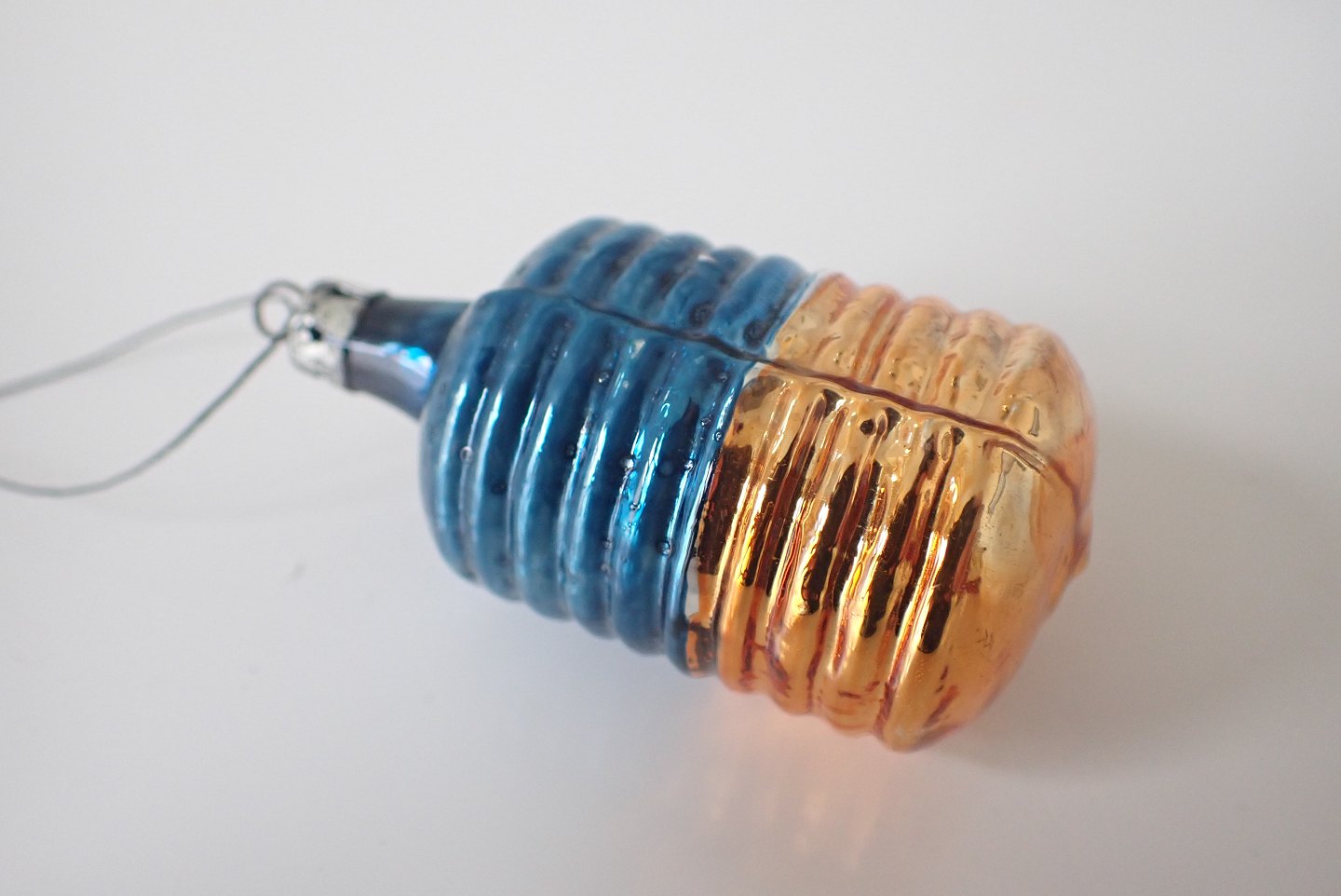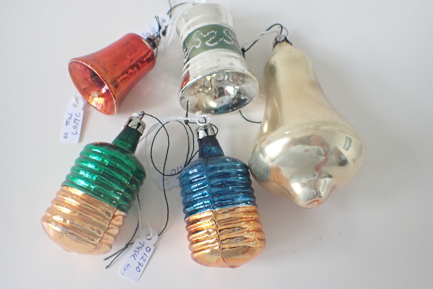 Text available in Danish: 5 glasornamenter - 3 klokker i forskellige størrelse og 2 lygter.