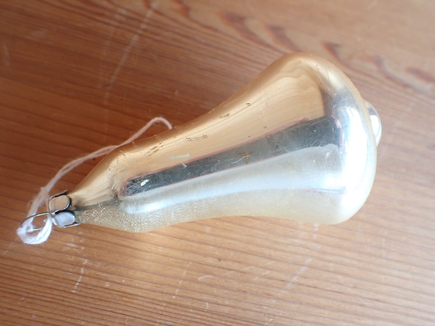 Yderst til venstre: Klokkeform i sart lyserød med hvid bemaling. Russisk. Med ophæng. Højde:10 cm. Bredeste diameter: 5 cm. I pæn stand. Pris: 175 kr.
